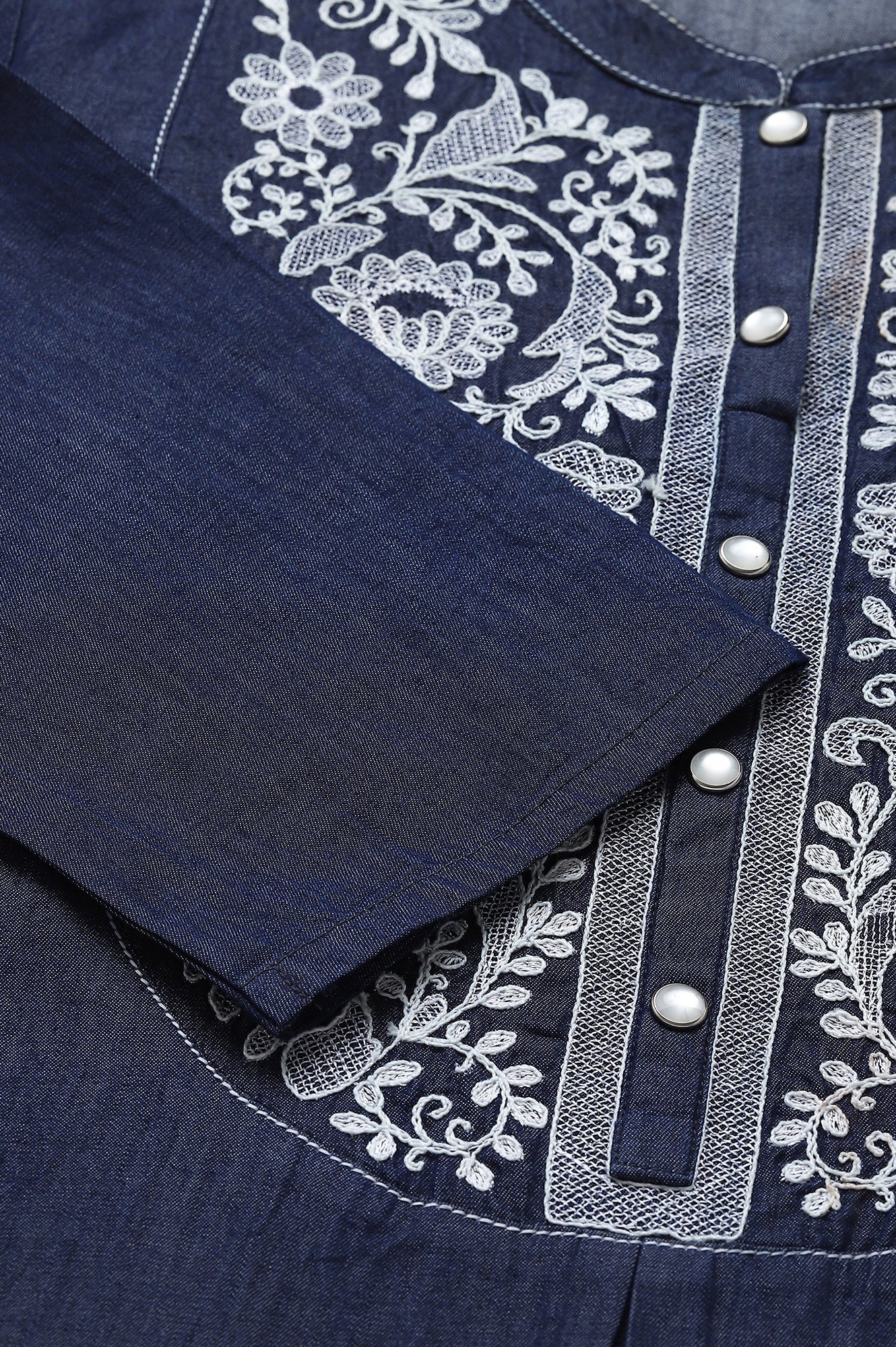 This denim kurta features a delicate dori embroidery in pristine white thread, a mandarin collar and moon snap buttons, making it a perfect mix of comfort, beauty and relaxed sophistication. Pair it with our denim trousers to elevate your look.
