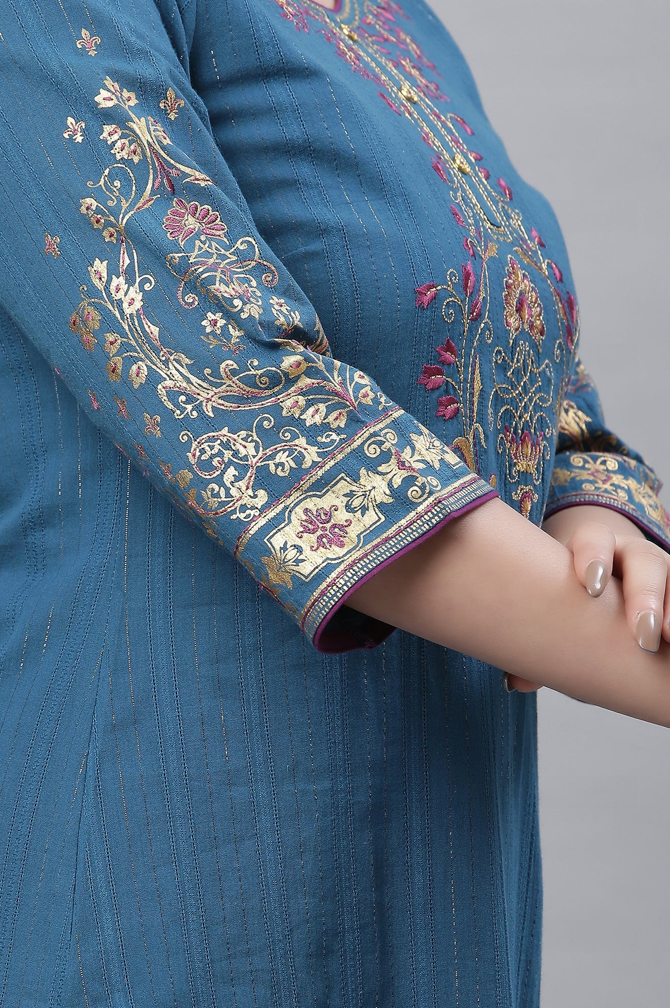 This uniquely handcrafted kurta with exclusive contrast embroidery on yoke and gold print on sleeves. This Aurelia kurta with embroidery highlight is apt for your festive celebration. Tuxtured fabric gives this kurta a rich look.