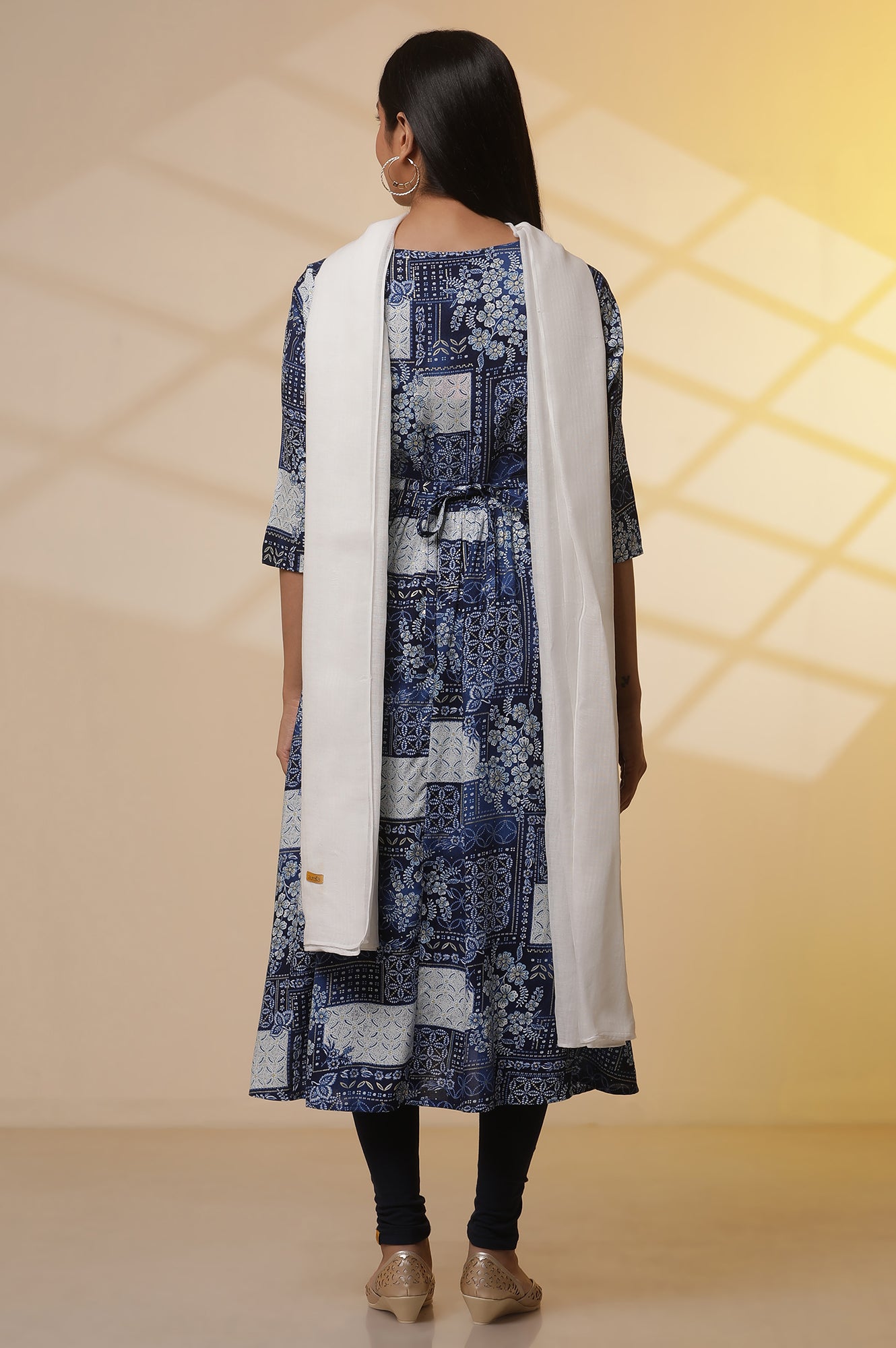 Blue Patch Printed Flared Kurta, Tights and Dupatta Set