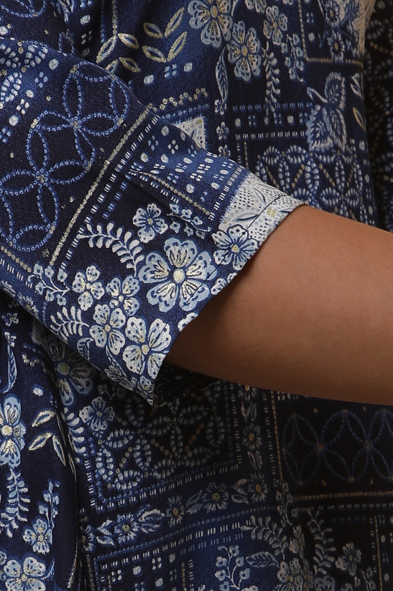Introducing our patch printed rayon kurta set, a stylish choice for any occasion. The kurta has round neckline adds a classic touch, while the tab-look belt detail creates an intriguing element. It is paired with navy blue tights and cotton dupatta.