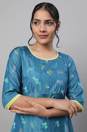 This A-line silhouette kurta set is a playful delight of our collection. This set includes beautiful floral printed kurta having contrasting lace and buttons. This chic top-wear comes with contrasting lemon yellow tights.
