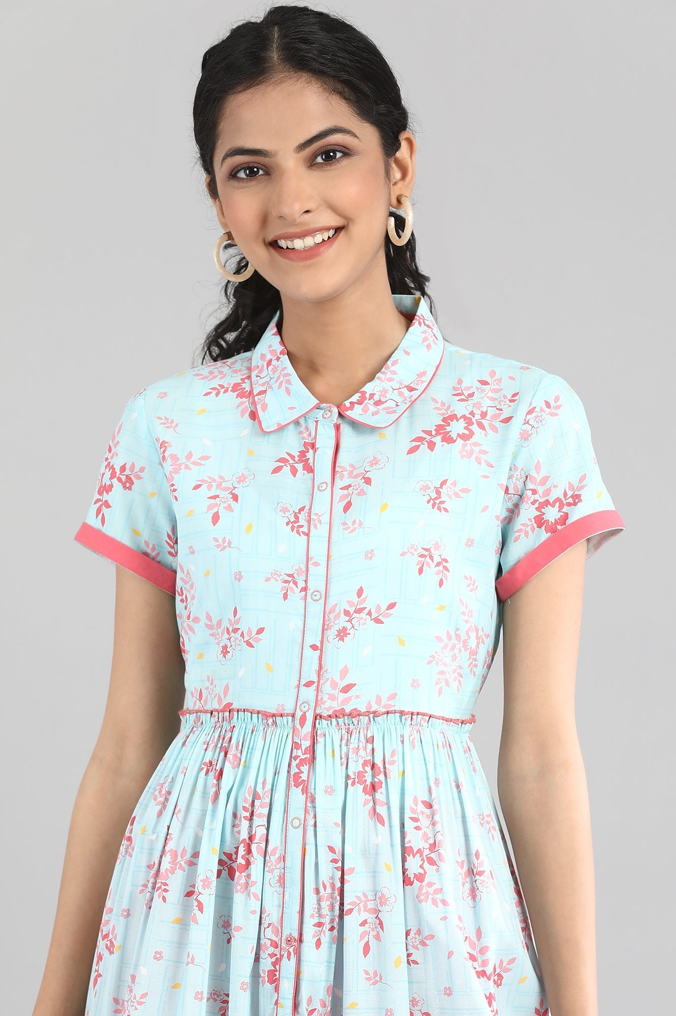 A-line plum blue printed kurta in shirt collar and regular short sleeves. The kurta featuring full button placket at front.