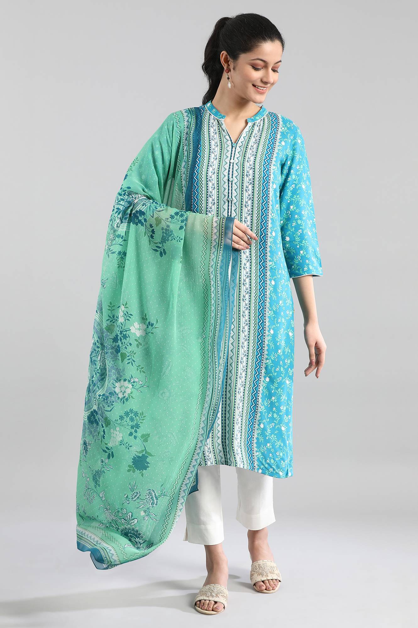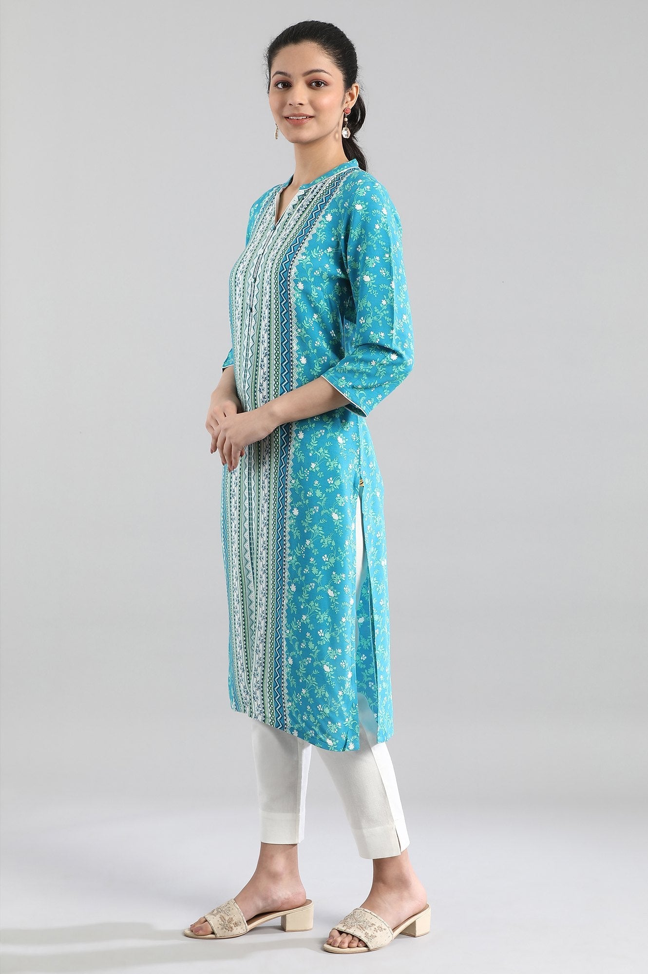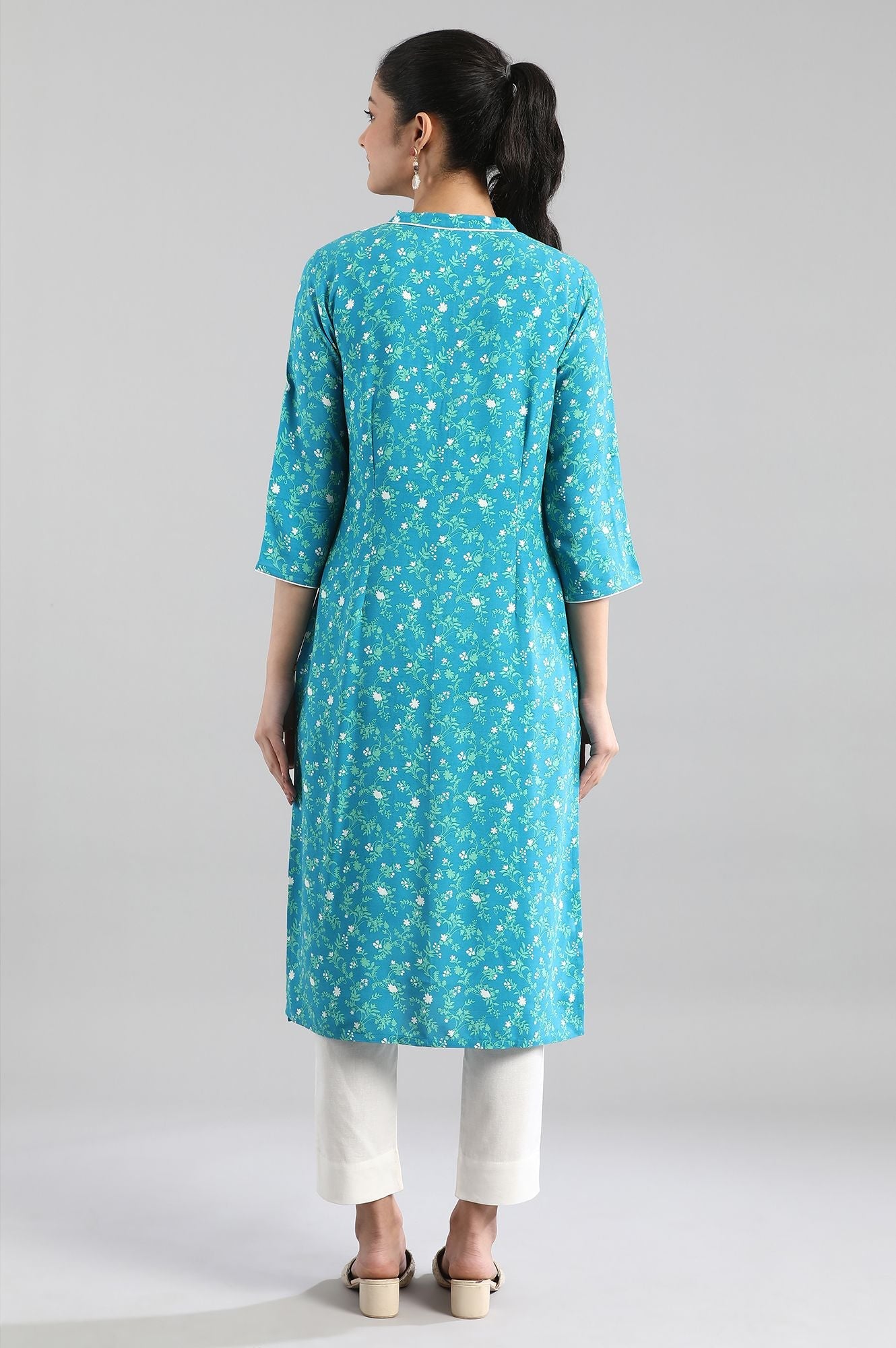 Algiers blue printed kurta in band with V collar and buttons at front.