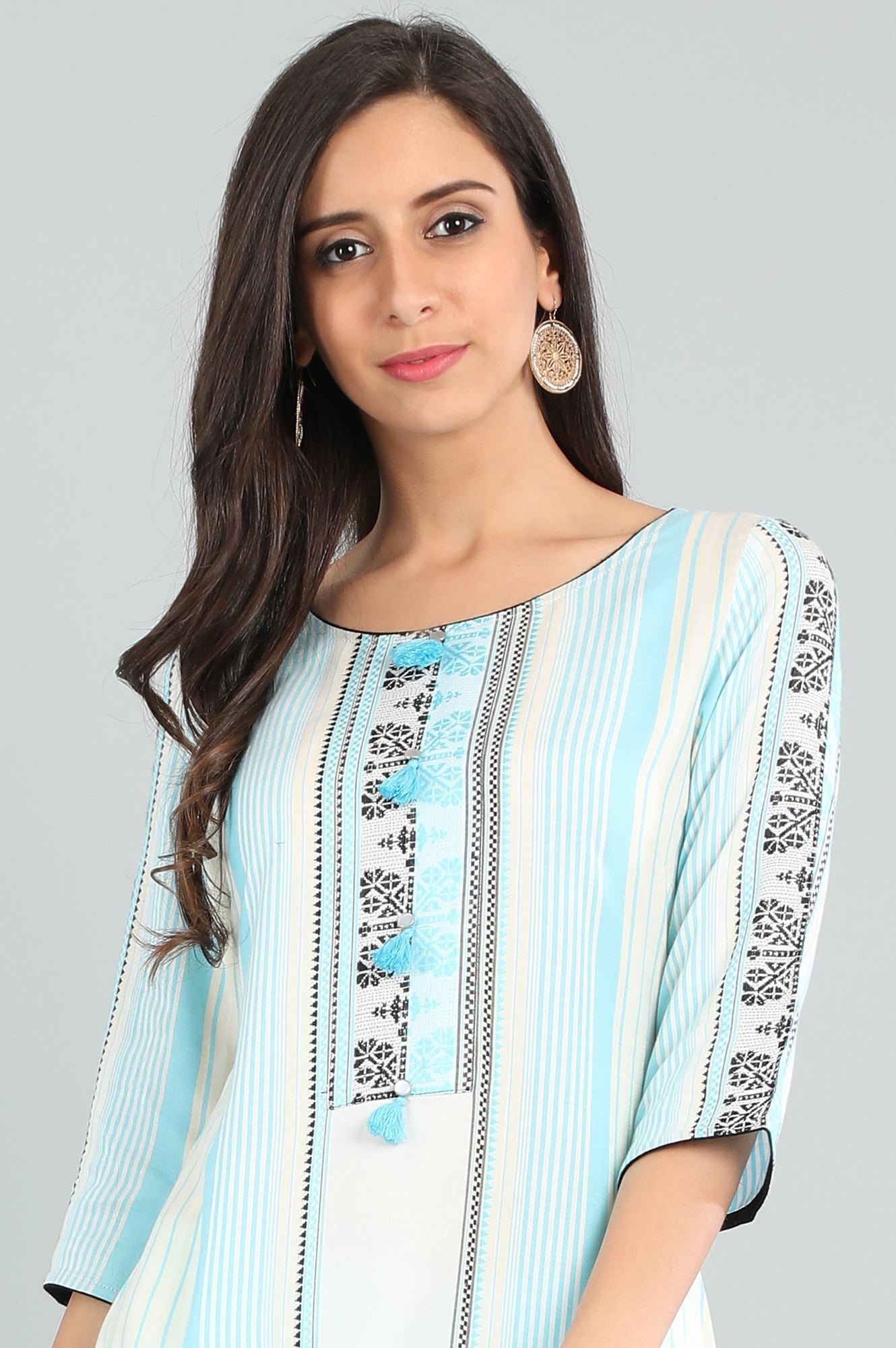 Blue round neck yarn-dyed kurta with mock placket on the front.