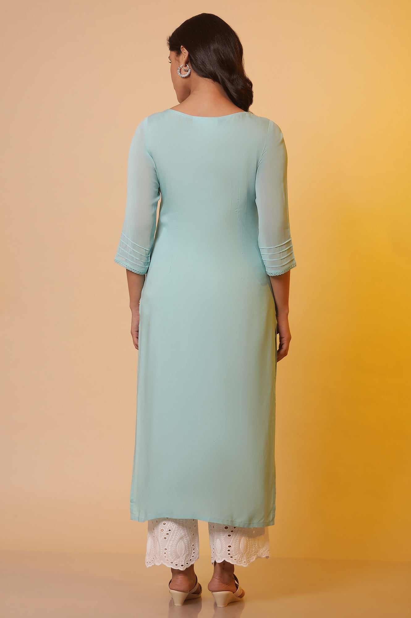 A pastel blue coloured kurta with contrast schiffli embroidery. Elevated with 3d embroidery and lace detailing on neck, sleeves and kurta's hemline.