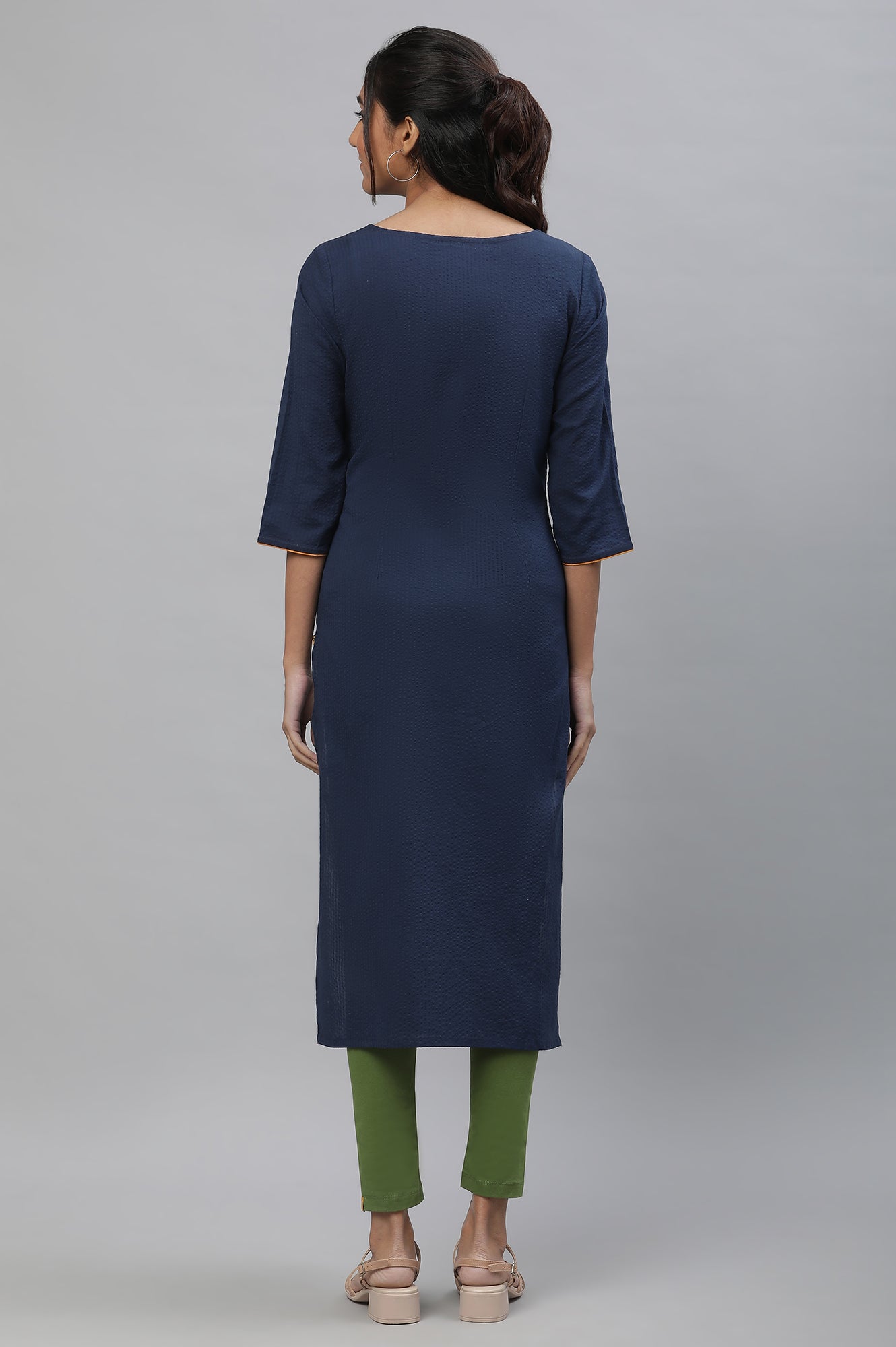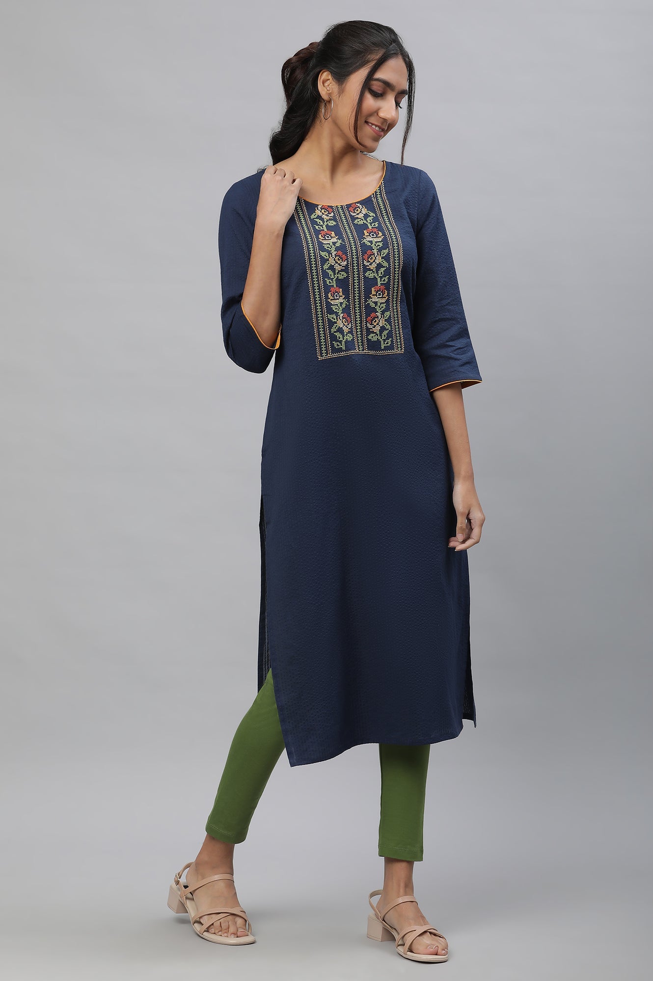Stand above the crowd by wearing our seer sucker textured kurti with vibrant floral yoke embroidery. It has contrast piping which gives this piece a lift and gives you an option to choose between different colors of bottom to go with it.