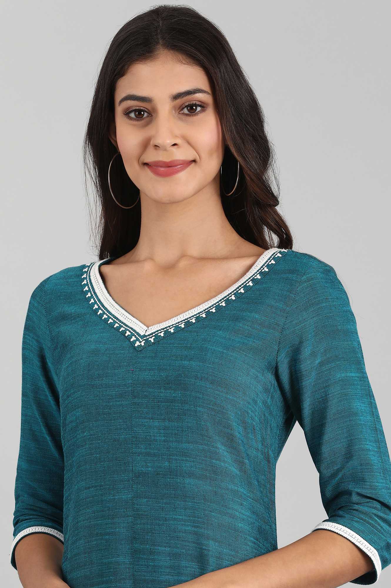 Blue V-Neck Yarn-dyed Liva kurta