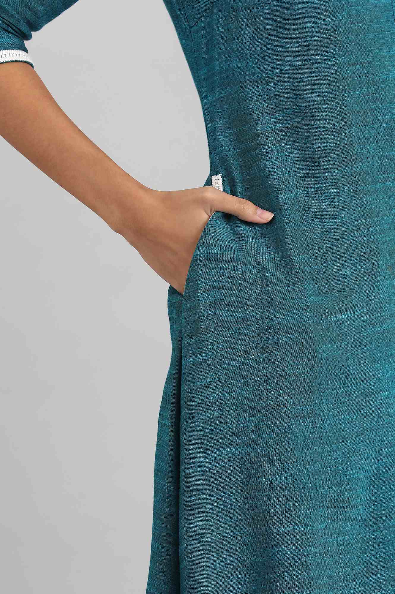 Blue A-line yarn-dyed Liva kurta with asymmetrical hemline and pocket detail.