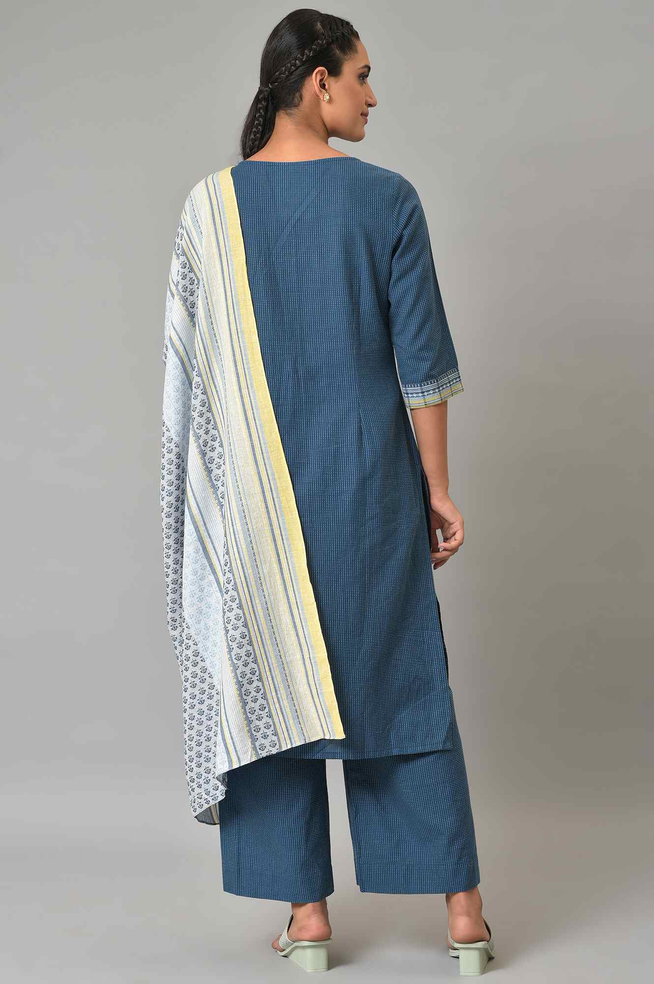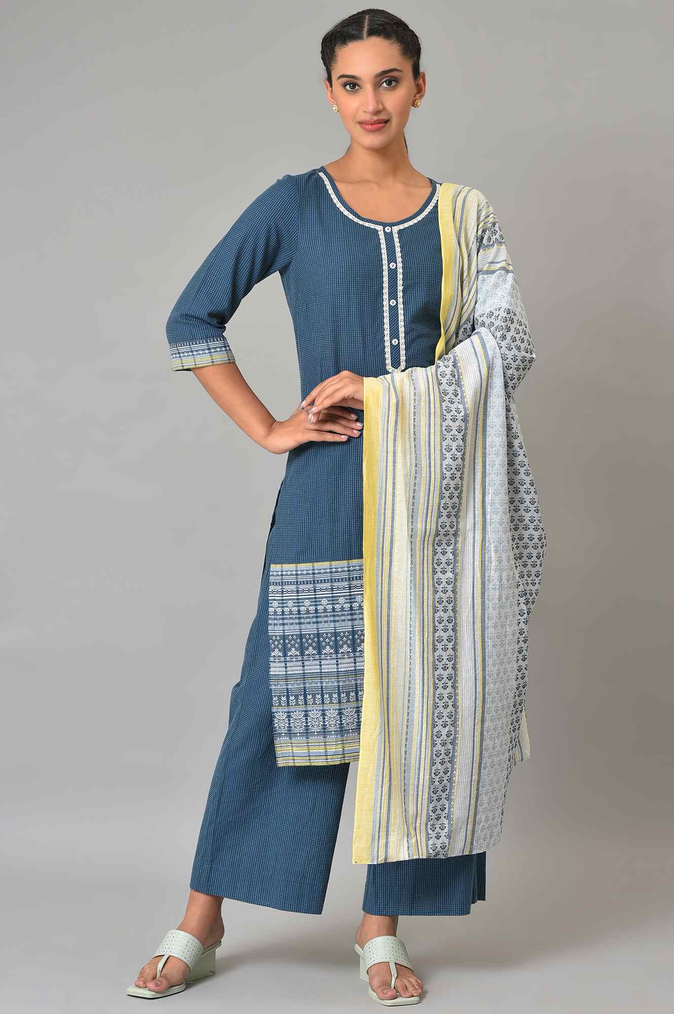 This Three-Piece kurta Set Includes A Body-Skimming Straight kurta, A Straight Palazzo And A Complimenting Dobby Dupatta. Crafted In Intricately Woven Yarns, It Features Floral Motifs In Shades Of Blues, White And Yellow.