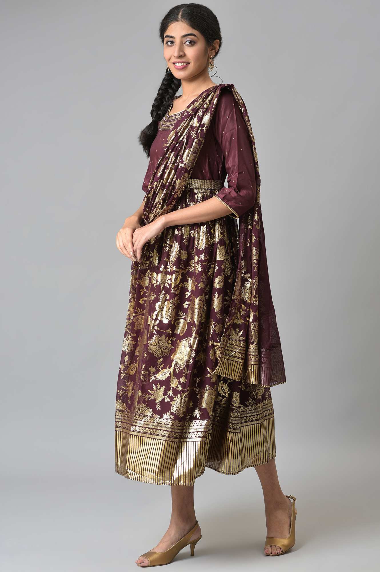 Look like a flawless diva in this heavy floral printed saree dress that comes with a attached drape at the waistline. It is enriched with heavy gold foil print.