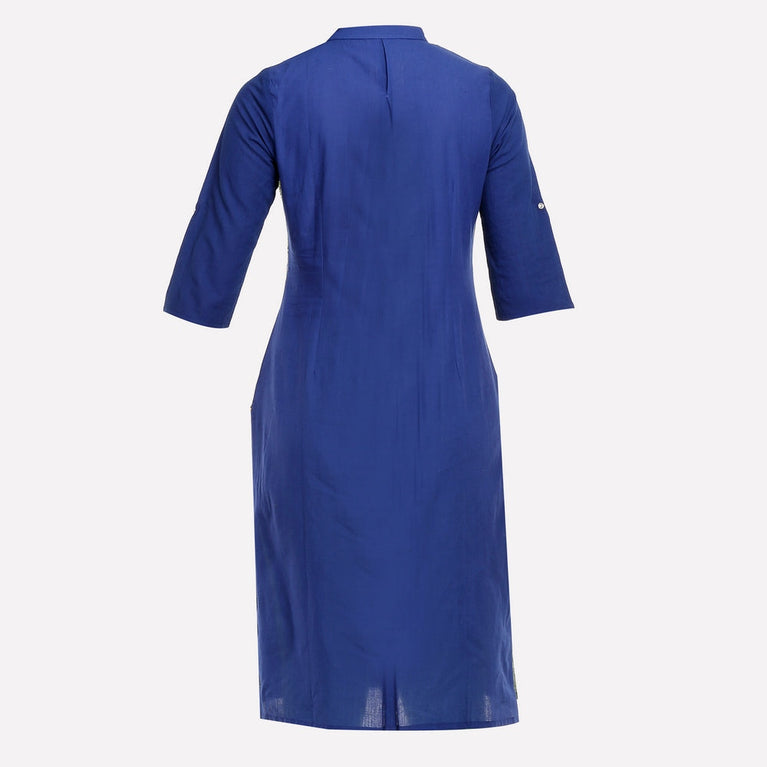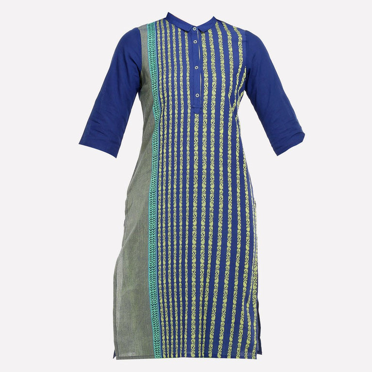 This straight kurta in a blue batik print is a versatile addition to your everyday wardrobe. Crafted from soft, breathable cotton, it features a classic round neckline and a relaxed silhouette, making it perfect for day-to-day outings with comfort and style.