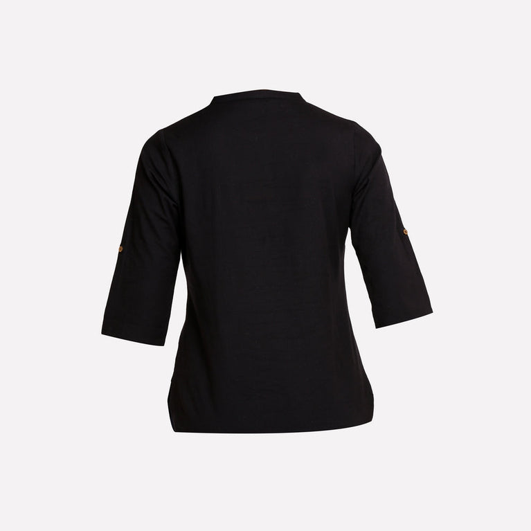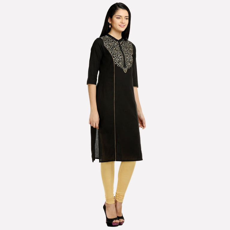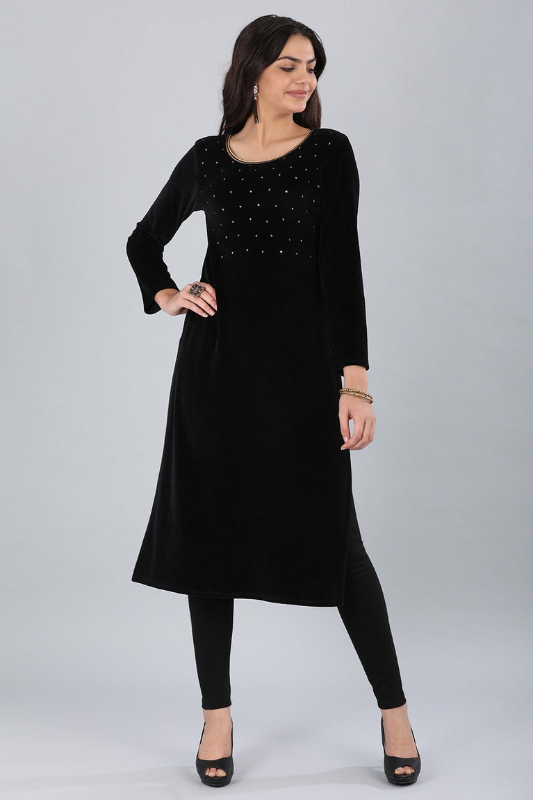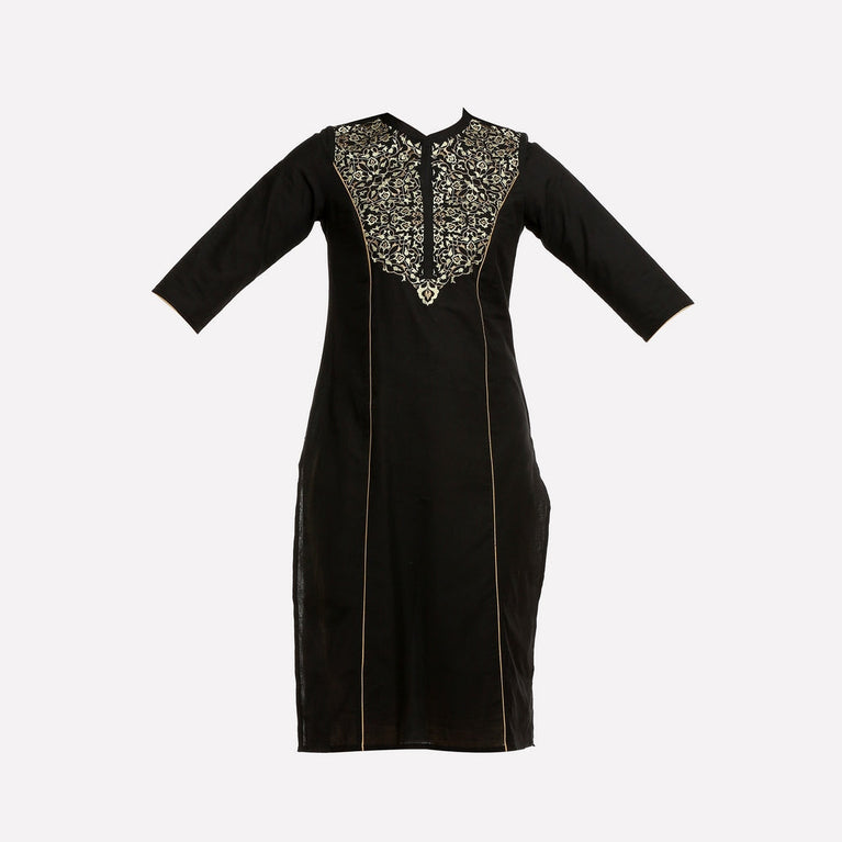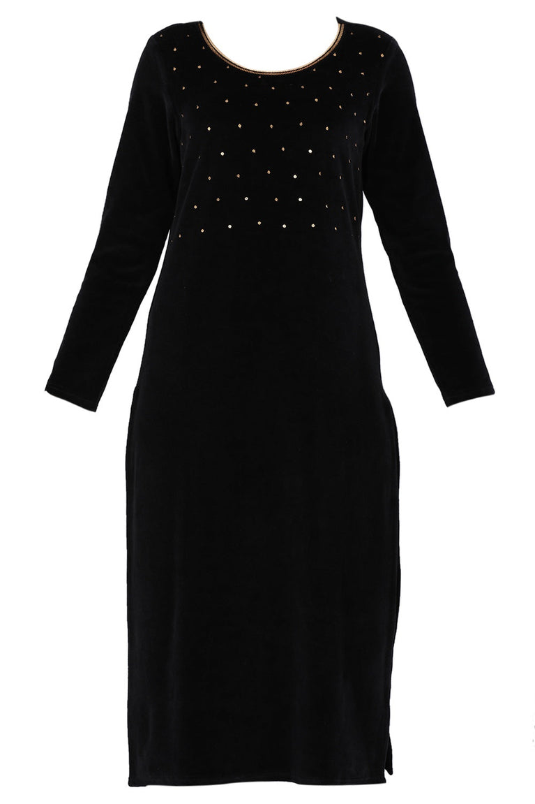 You can never go wrong with this interesting black and golden kurta set. Get ready for festive look with this straight silhouette printed kurta, it features embellished neckline. The kurta is paired with golden tights and dupatta.