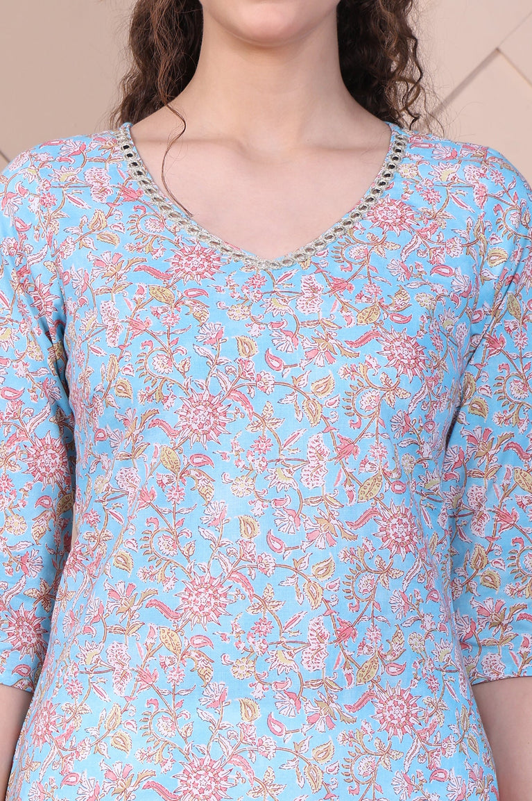 Add a touch of timeless grace to your wardrobe with this beautiful straight kurta for women crafted in natural cambric fabric. Featuring an all-over floral print in subtle earthy tones on a soothing pastel blue base, this kurta is a perfect blend of comfort and style. The soft texture and lightweight weave of cotton make it ideal for casual outings, summer get-togethers, and daytime festivities. Thoughtfully designed with 3/4th sleeves, a v neckline with embroidered detailing, this kurta brings effortless charm to your everyday ethnic collection.