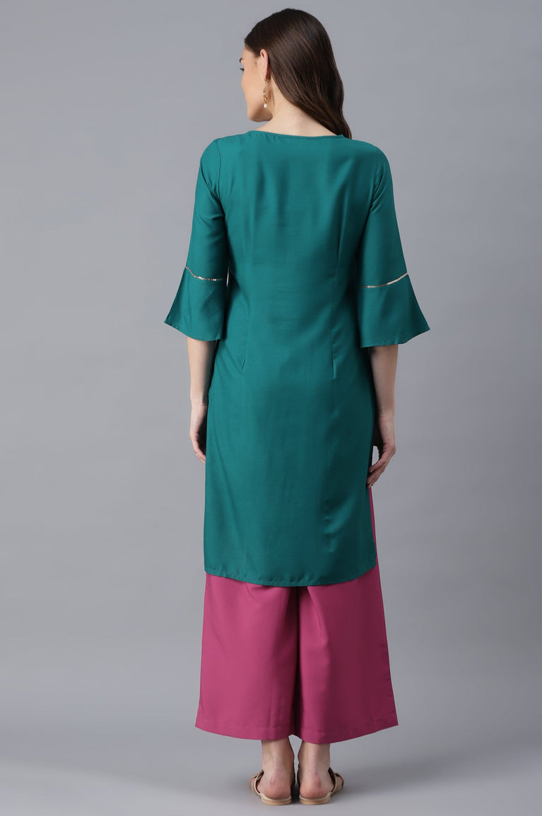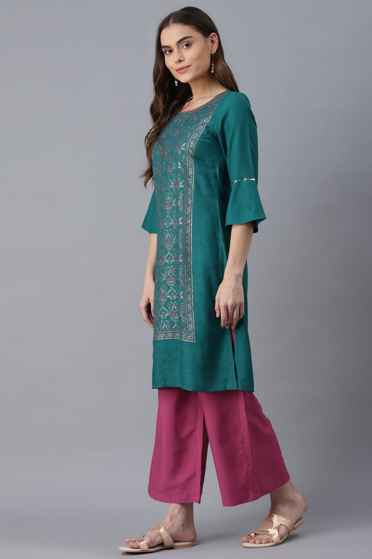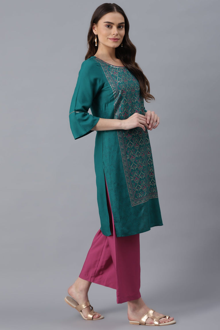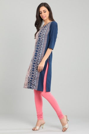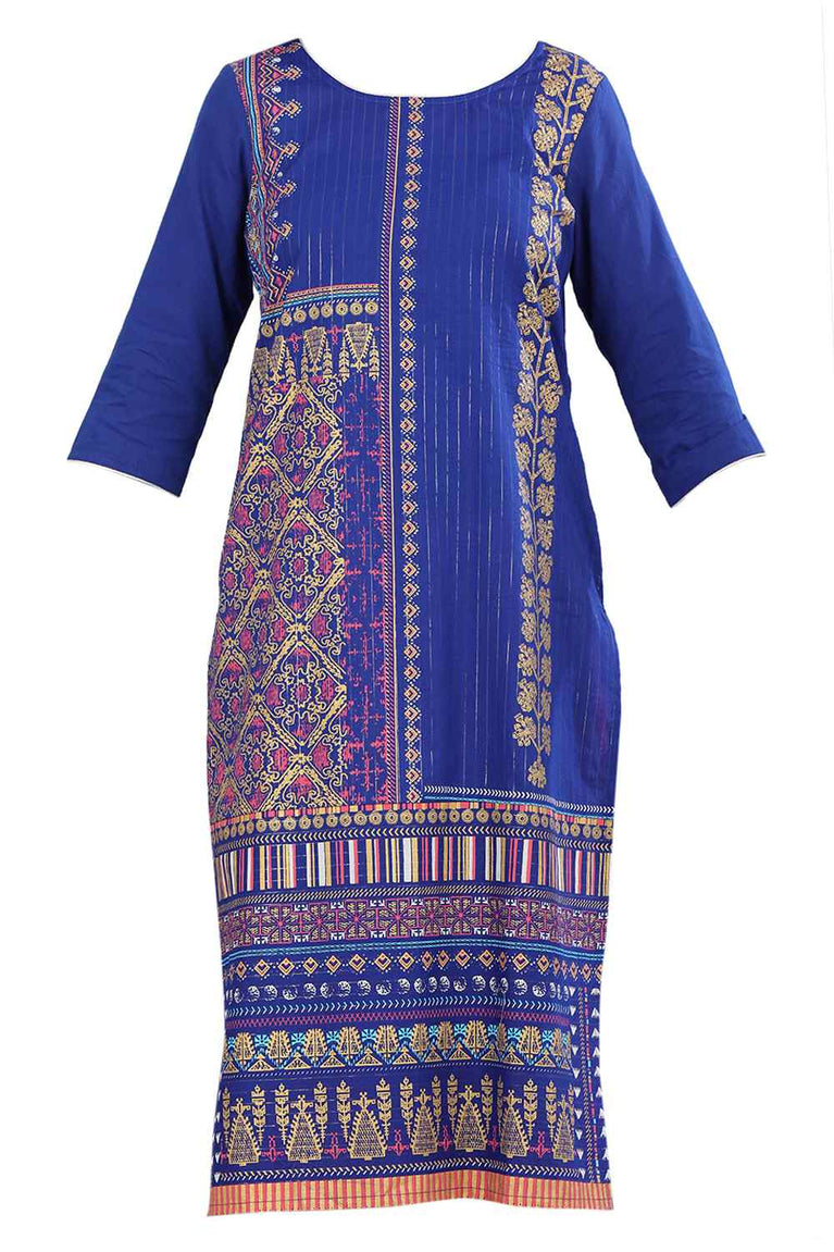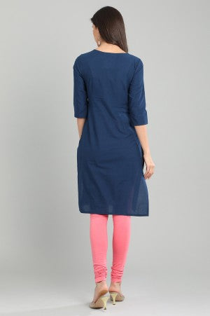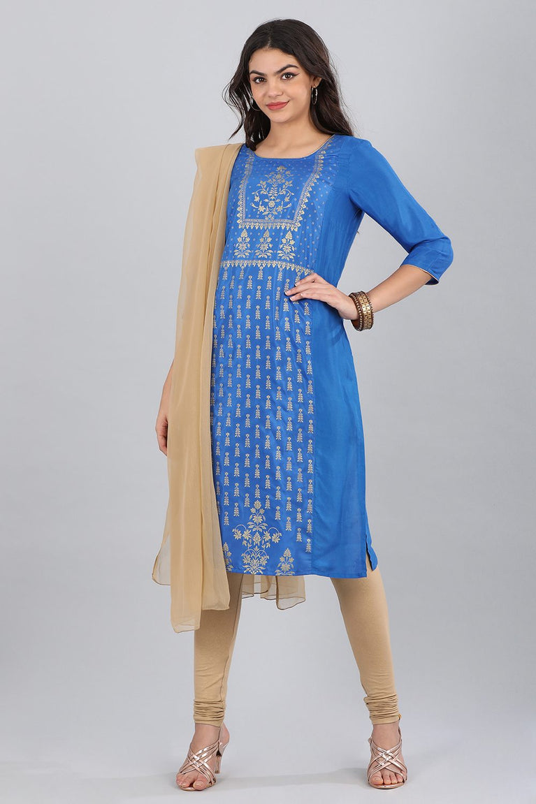 Blue round neck 3/4 sleeve kurta with printed detail.