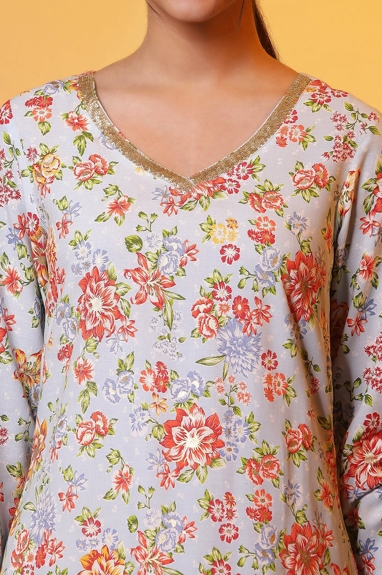 Blue Floral Printed Kurta with Embroidered Neck