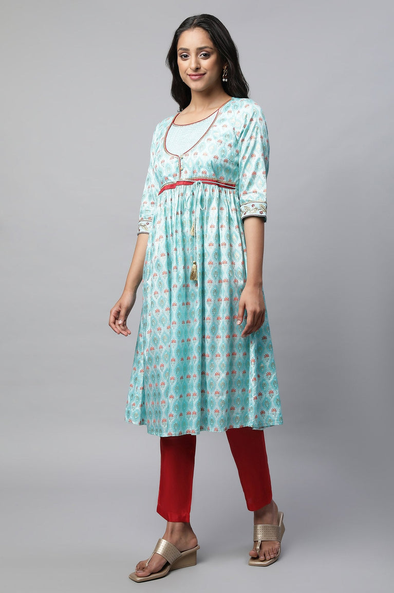 Flaunt Your Stylish Look In This Chic Aurelia Set. The Set Includes Blue Floral Printed kurta In Cuff Sleeves. It Is Paired With Red Trousers And Printed Dupatta.