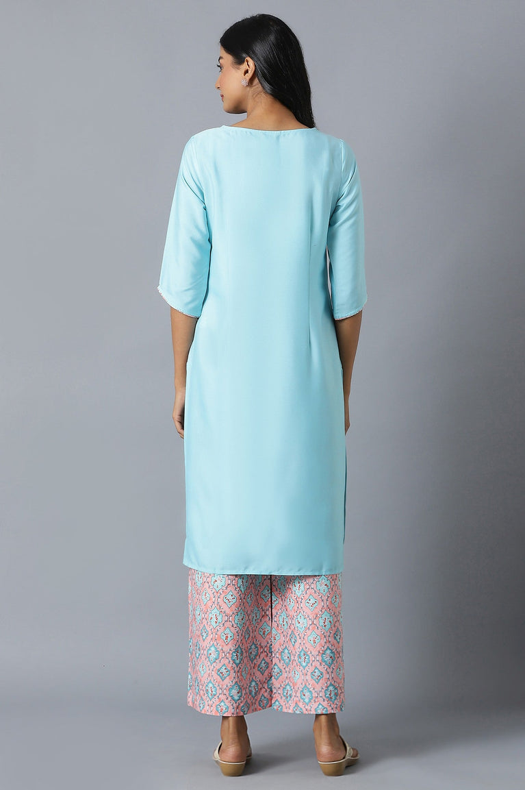 A perfect pick for your casual and workwear wardrobe. This blue straight silhouette printed kurta has round neck and three-quarter sleeves.