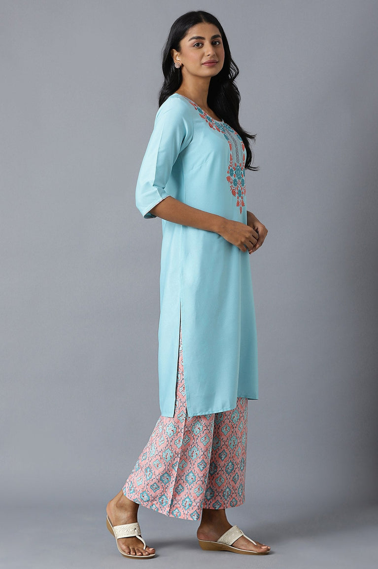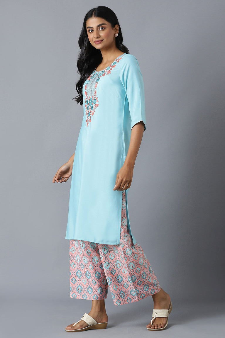 Revamp your casual ethnic wear wardrobe by adding these modern set. The set includes a blue straight fit kurta having thread embroidery on yoke and orange printed straight palazzo pants.