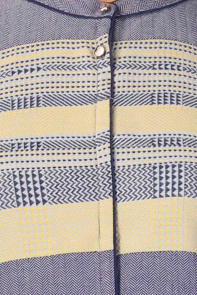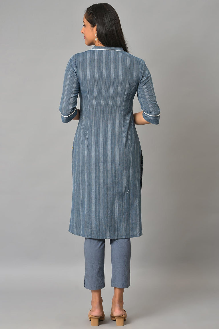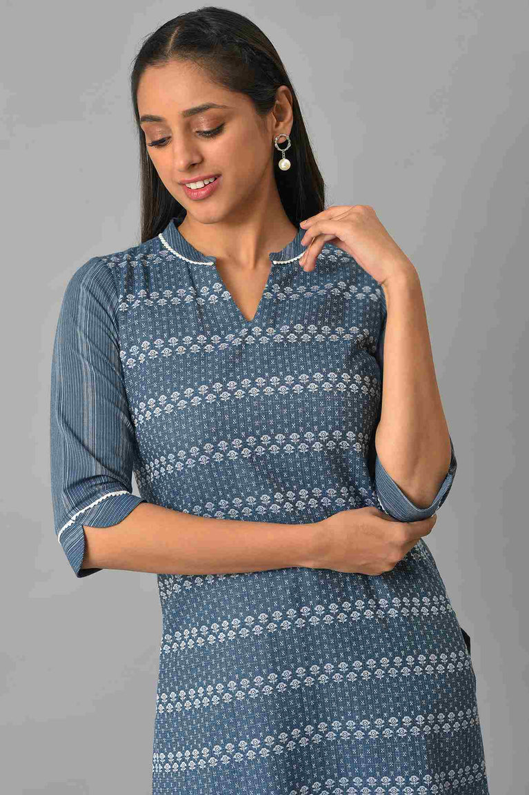 Blue mandarin neck kurta with printed detail and placket on the front.