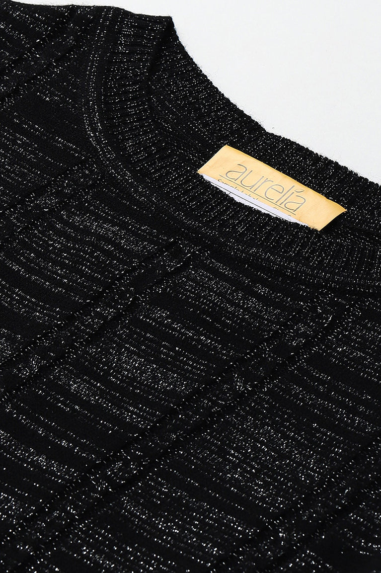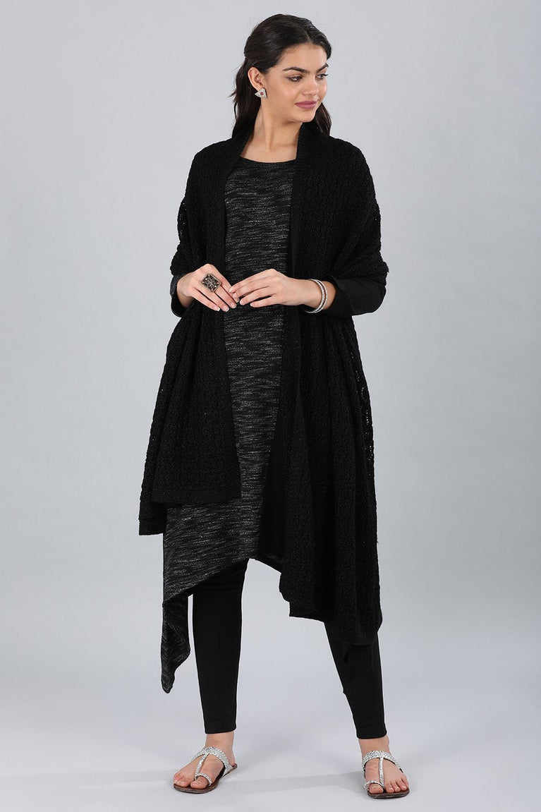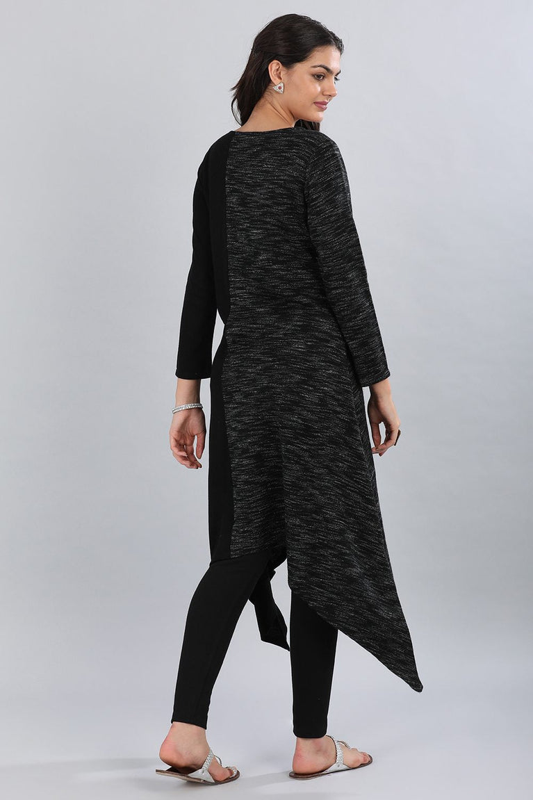 Black round neck yarn-dyed kurta with asymmetrical hemline.
