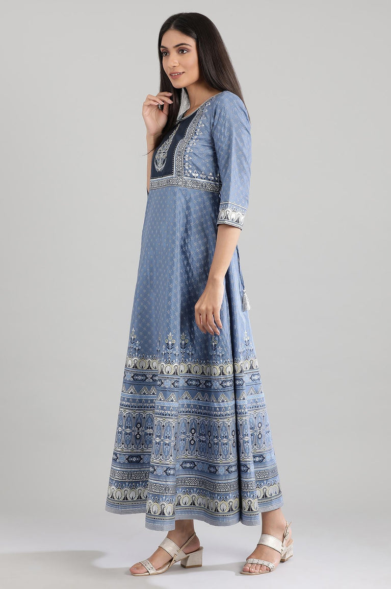 Light festive indian ethnic dress in sodalite blue colour is embellished with foil print and have border on hem and sleeves. It has mandarin collar with button closure.