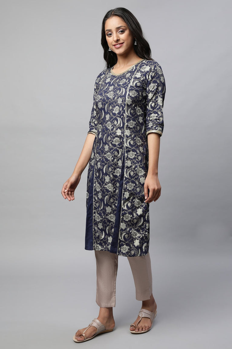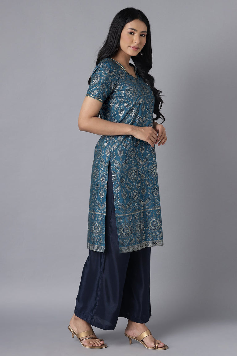 Twilight blue kurta having glittered floral print and sequin detailing. This straight silhouette kurta also features V-neck and short sleeves. It comes with solid blue palazzo in mid-rise and elasticated waistband.