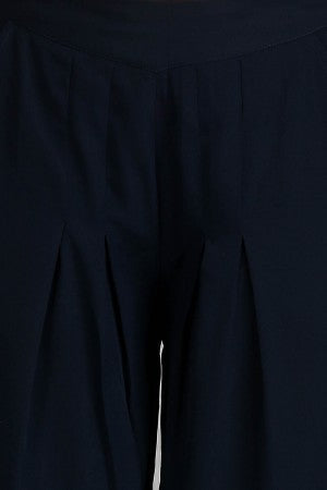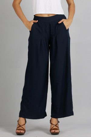 Blue solid straight fit palazzos with elasticated back, striped detail and tie-up detail.