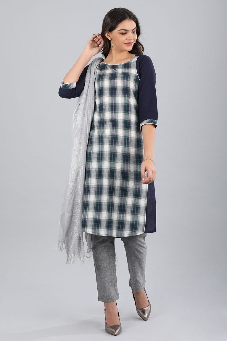 Black band collar with placket check print kurta having three-quarter sleeves. Paired with black solid palazzo in mid-rise and elasticated waistband.
