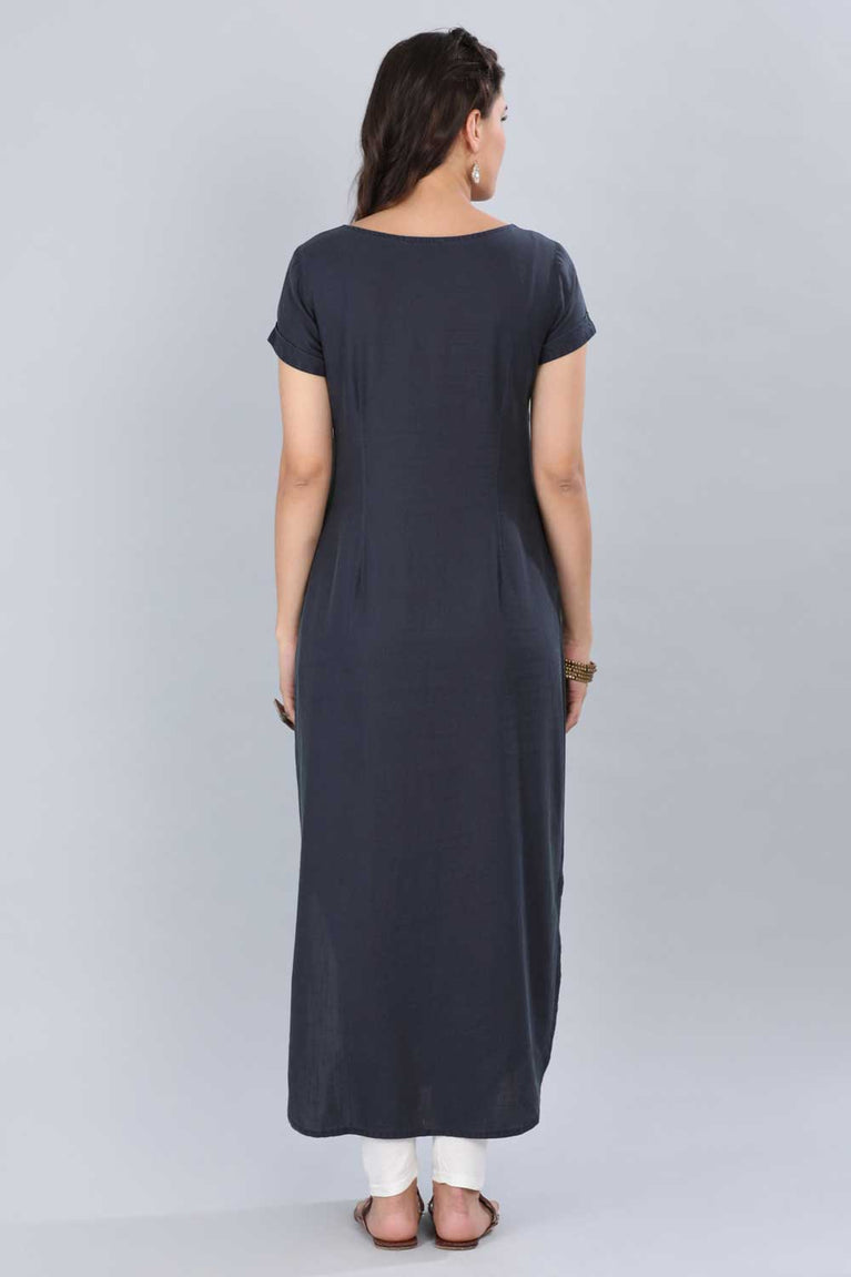 This blue mandarin neck 3/4 sleeve kurta has printed yoke and concealed placket on the front.
