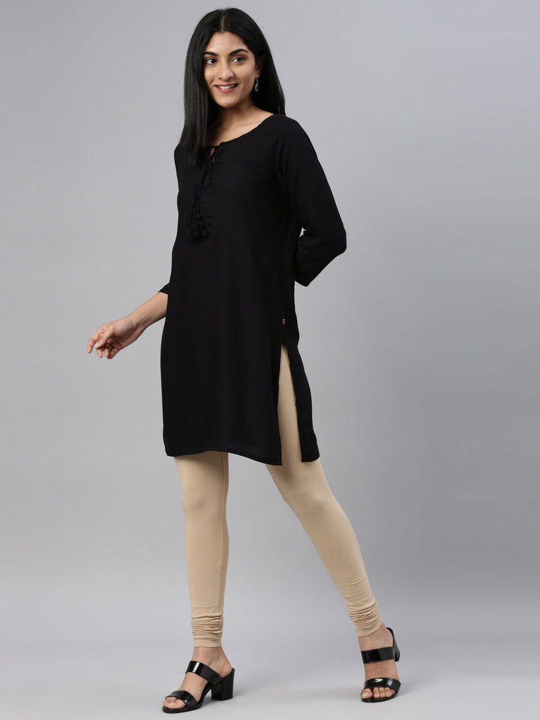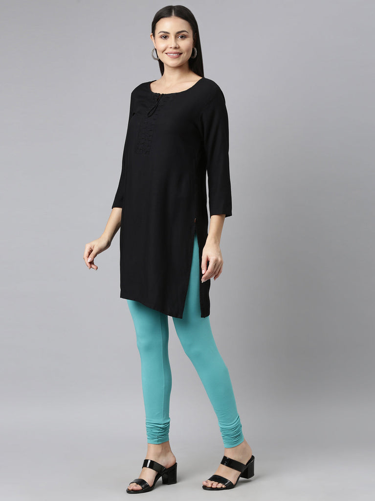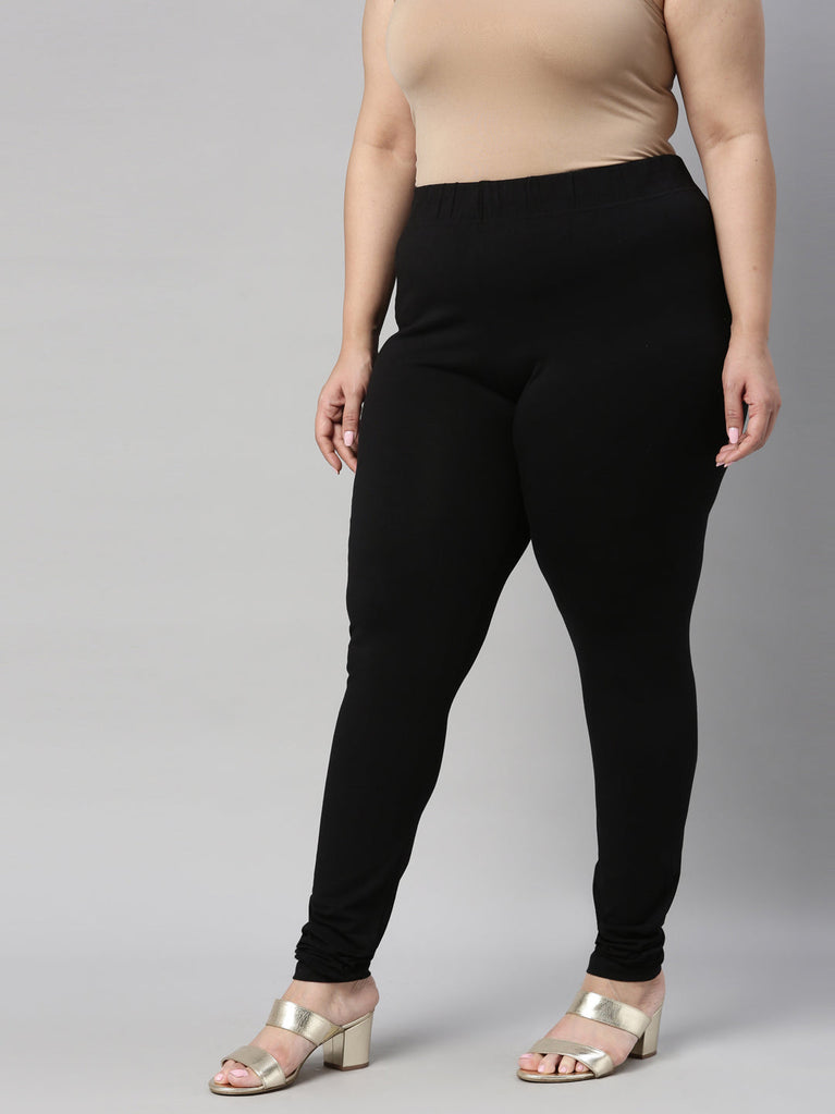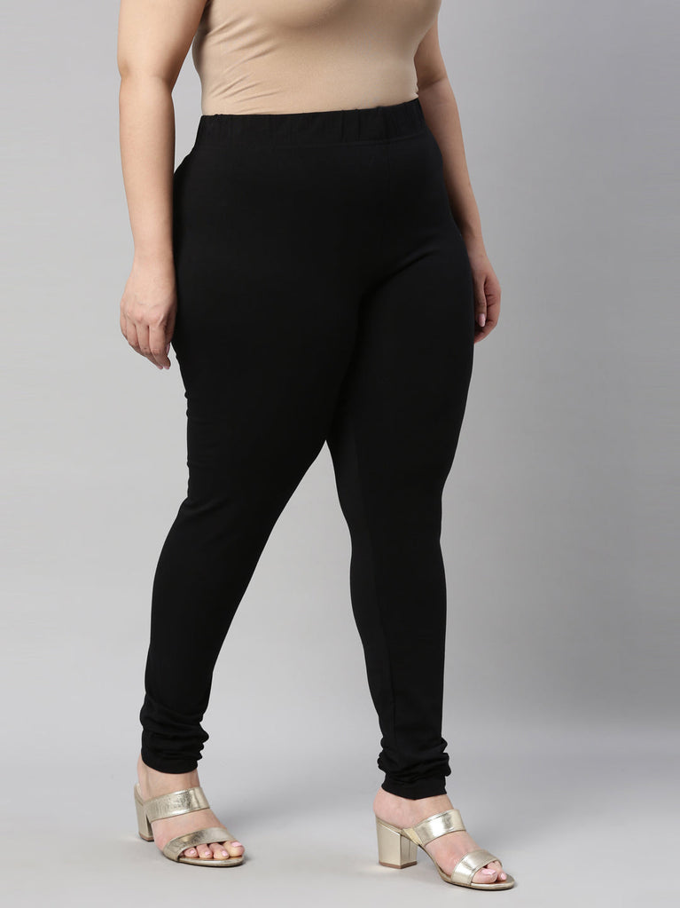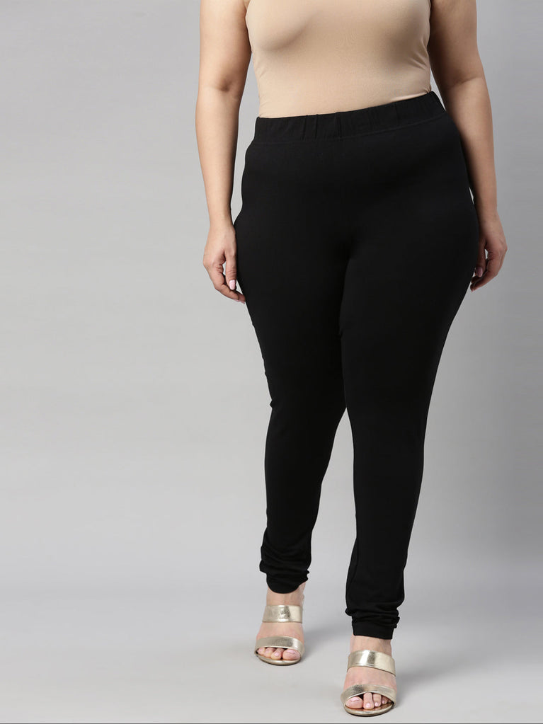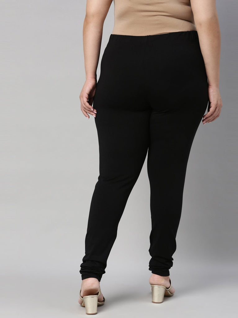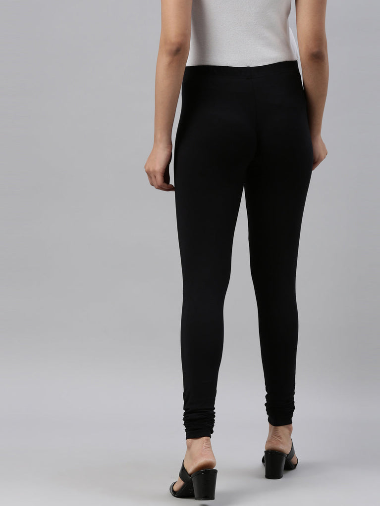Go chic with a pair of Black Solid Churidar Leggings. Made from high quality cotton, it has a elasticised waistband & gathers at the hemline.