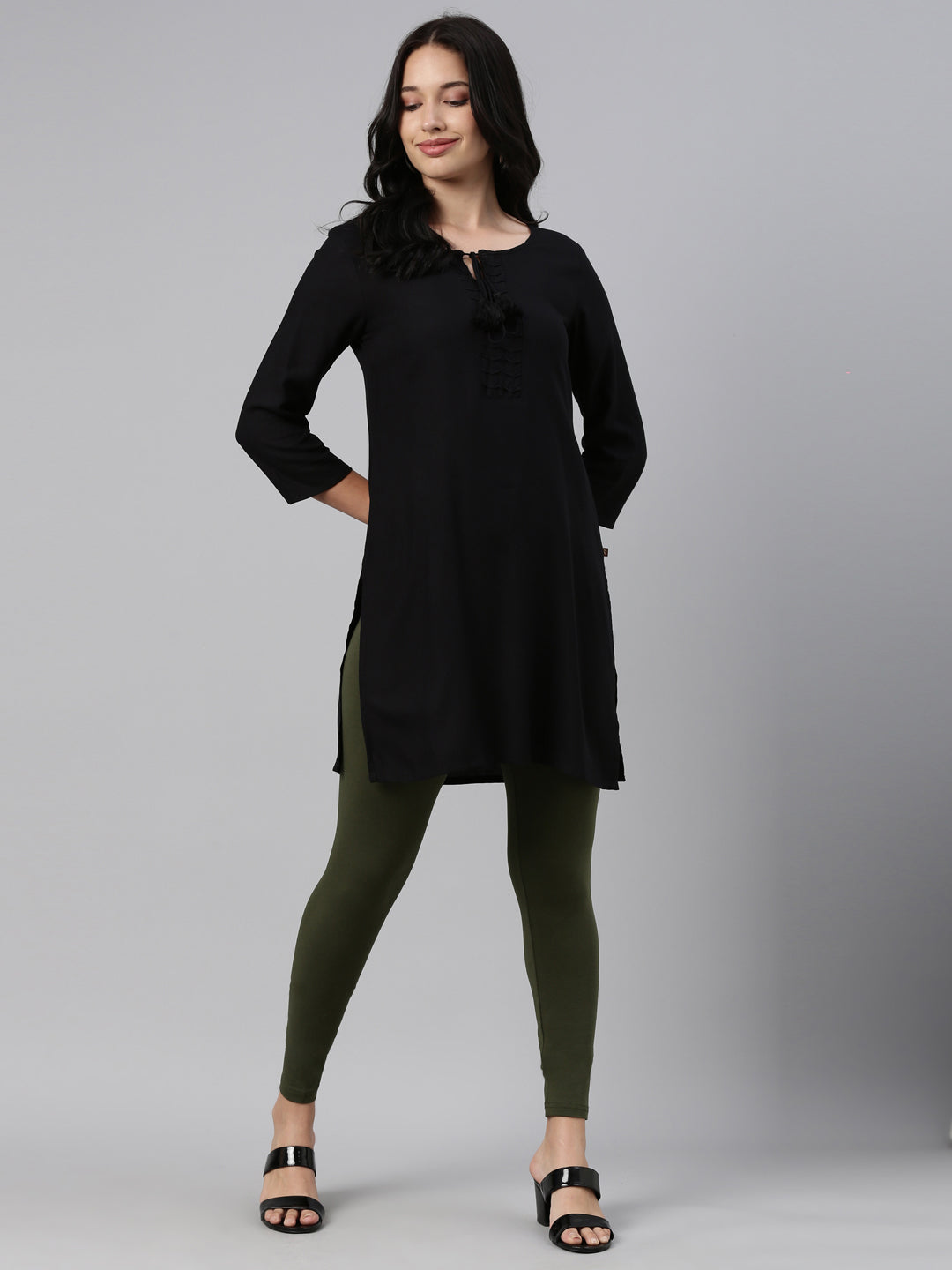 Complete any look, be it traditional or western with these Solid Dark Olive Leggings. Made from cotton & elastane, it has a elasticised waistband & has a slim fit.