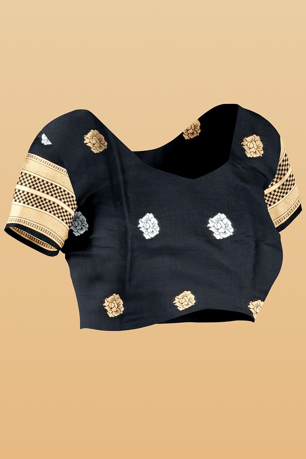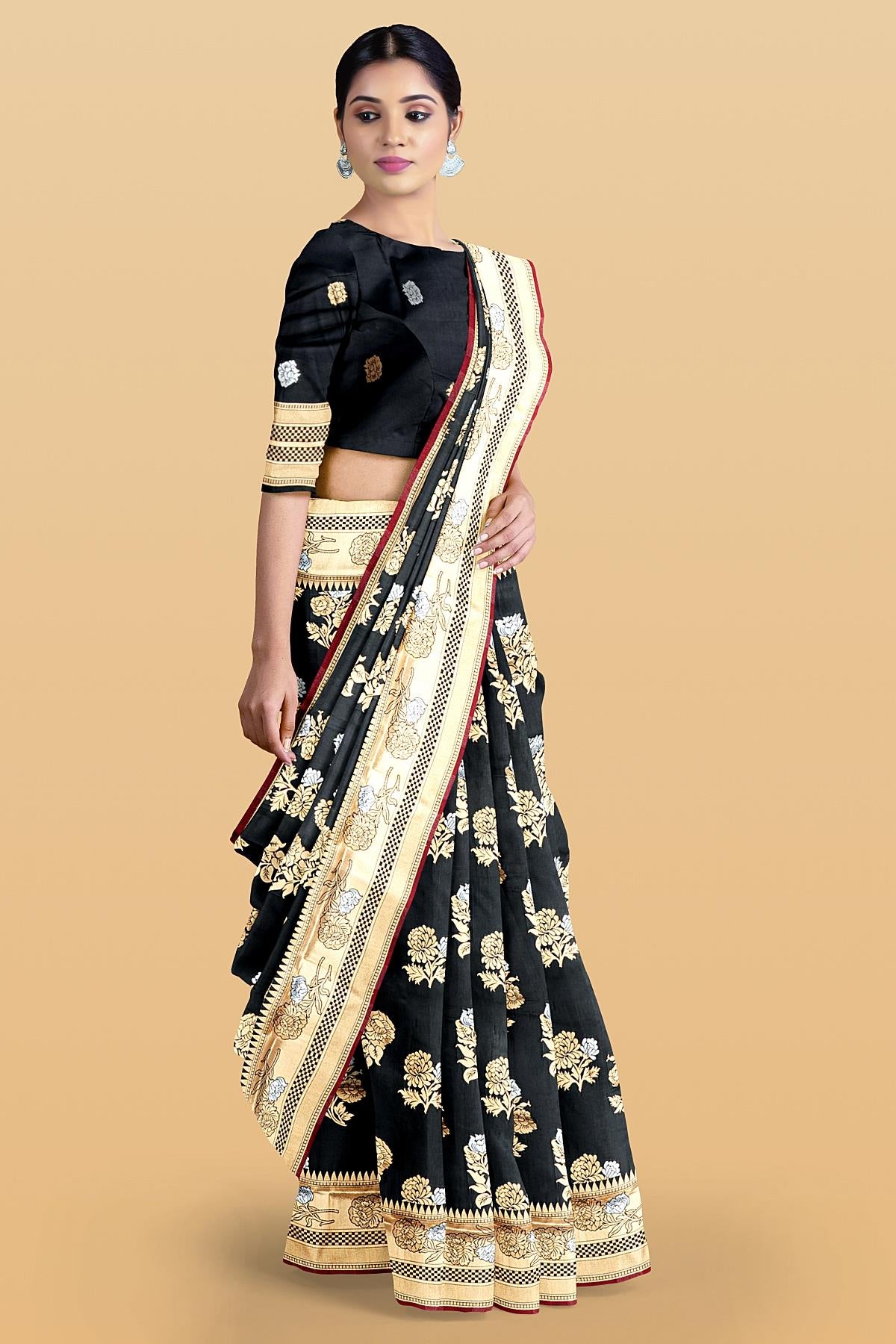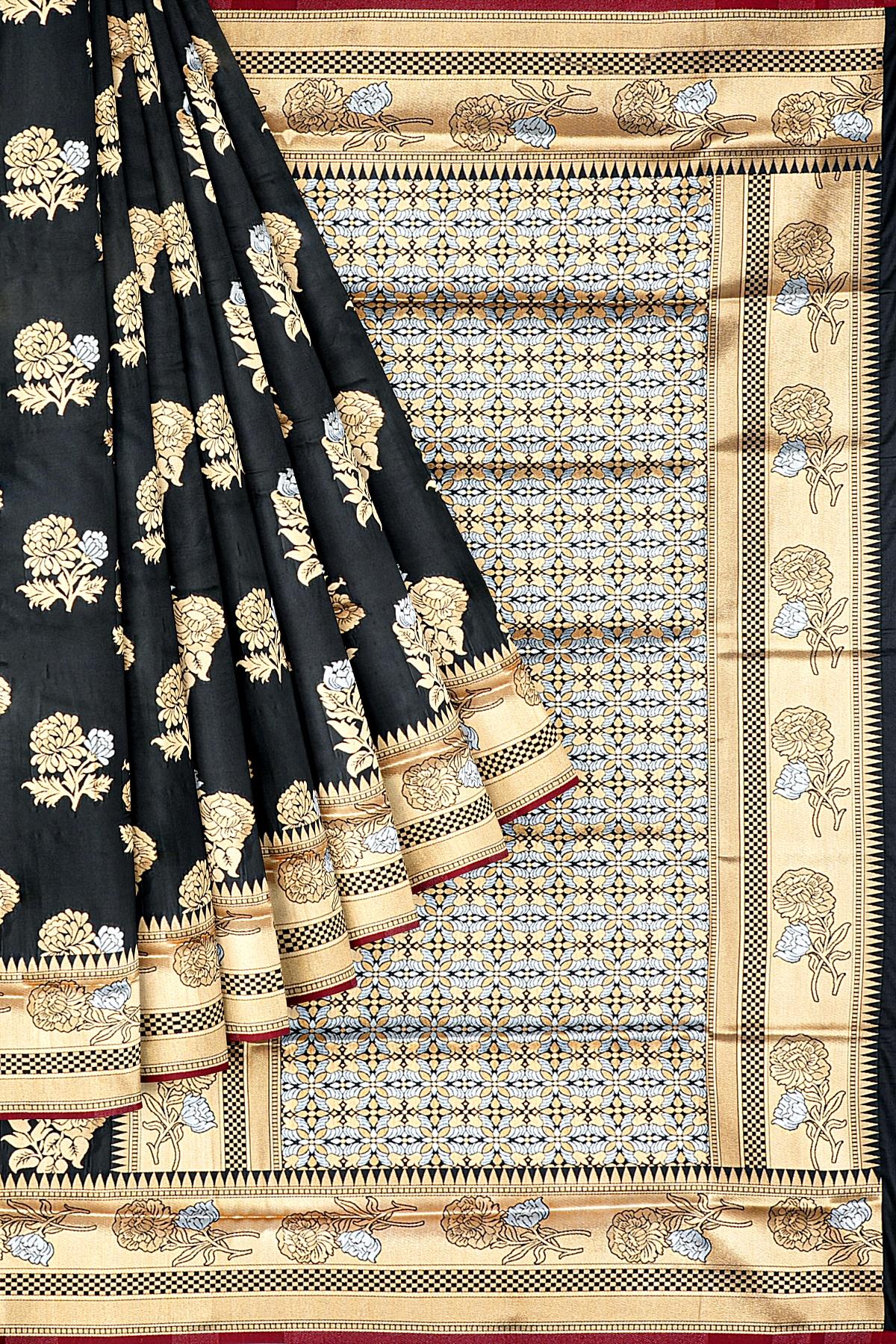 BLACK and GOLD FLORALS SILK BLEND Saree with SEMI PATTU