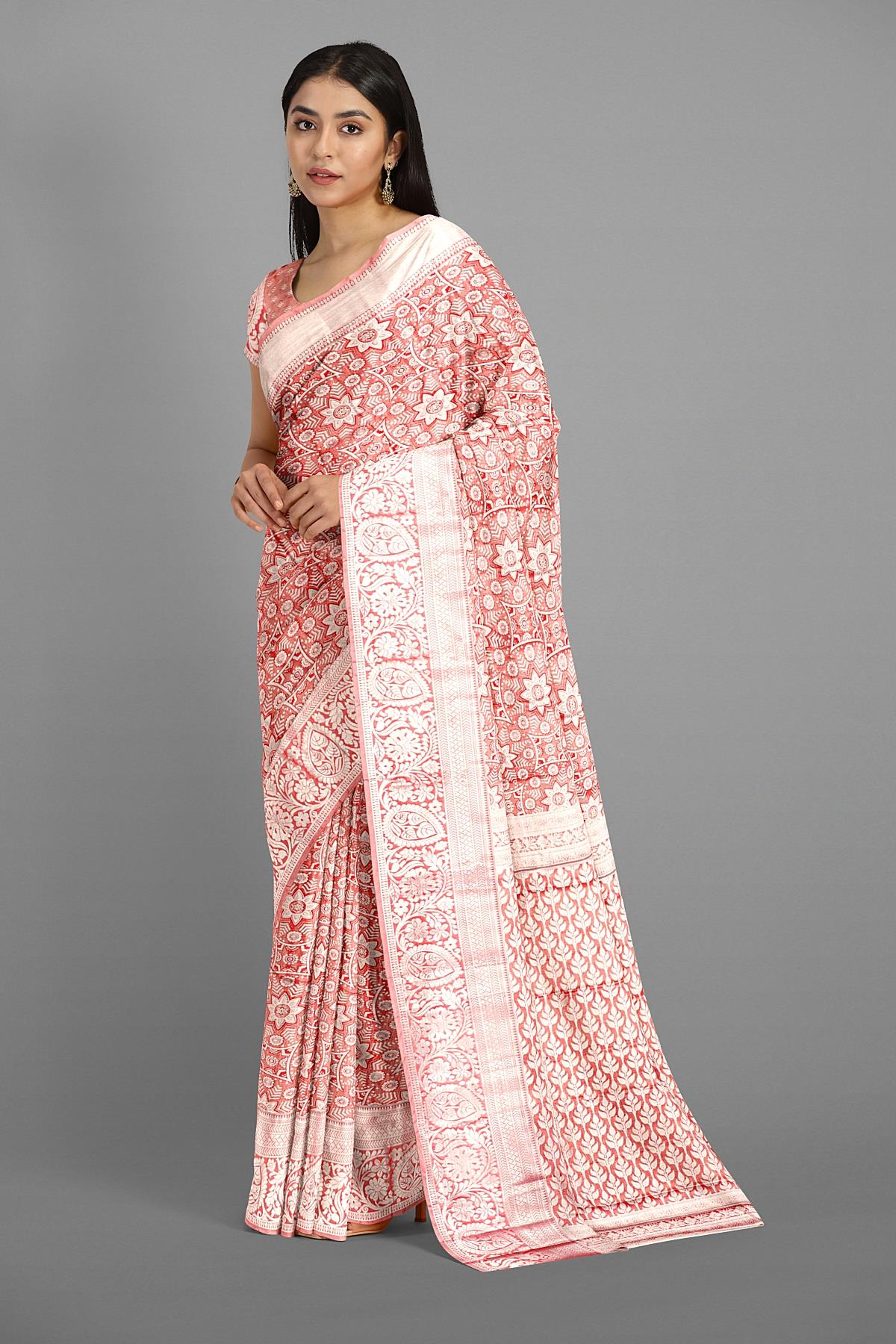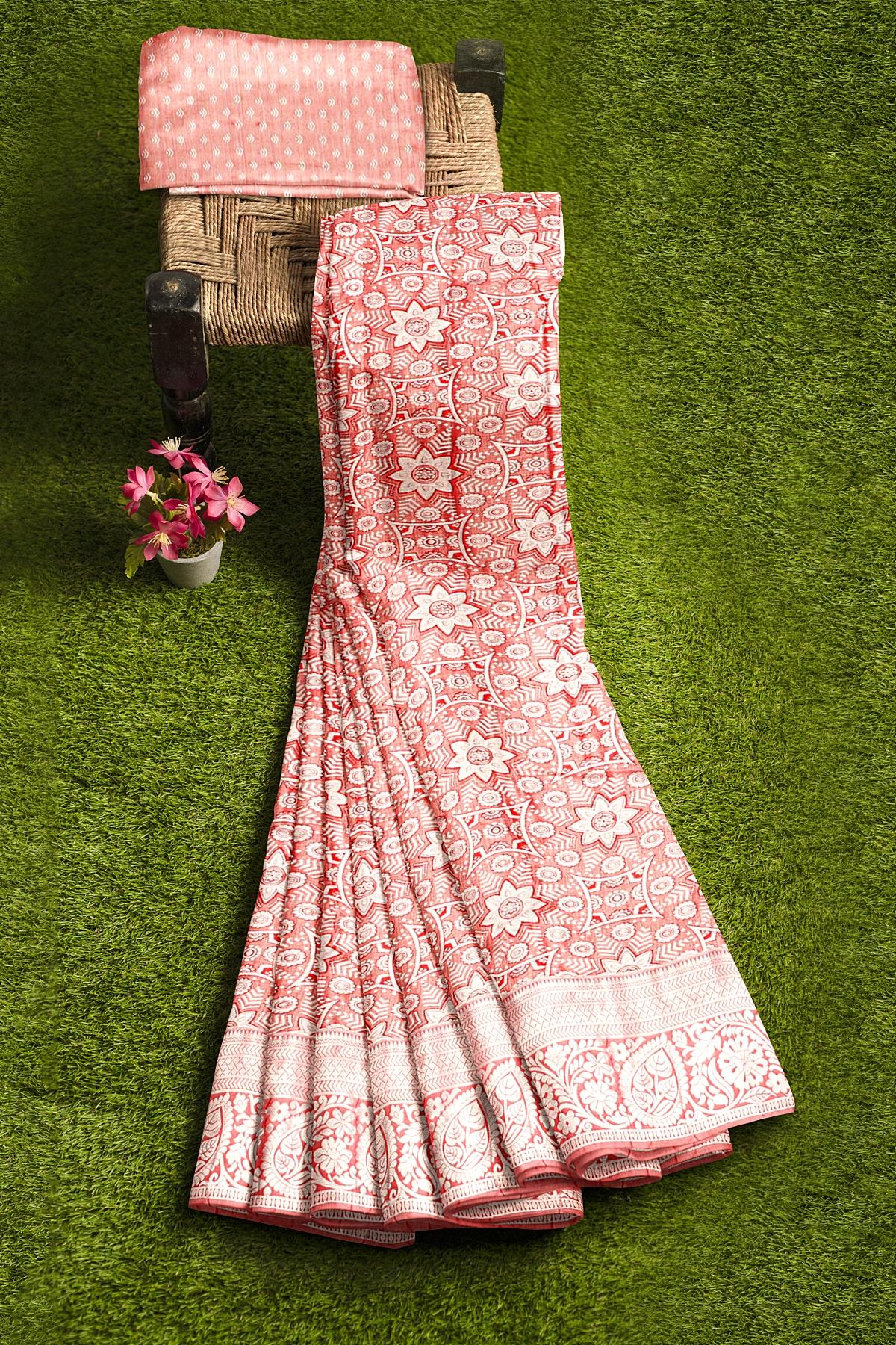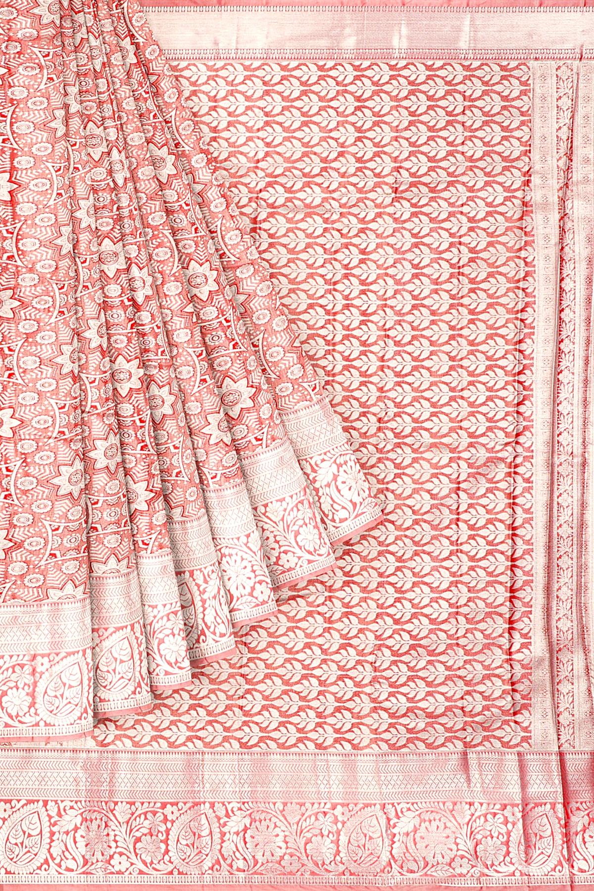 Latest BRICK FLORALS TISSUE SILK Saree with SELF ZARI border. This saree comes with ZARI WOVEN TISSUE SILK blouse.