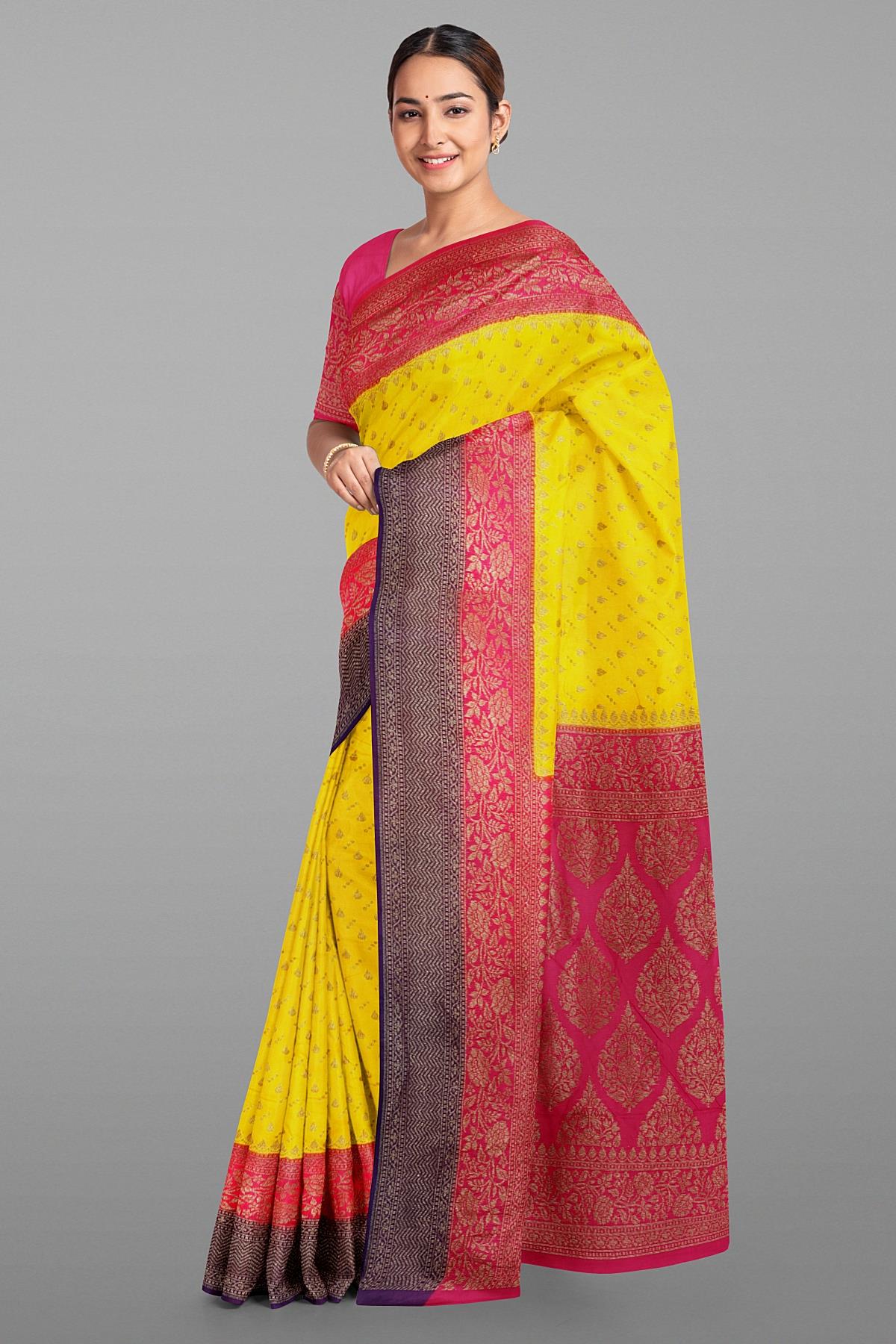Latest YELLOW BUTTIS SILK Saree with CONTRAST ZARI border. This saree comes with CONTRAST WITH BORDER SILK blouse.