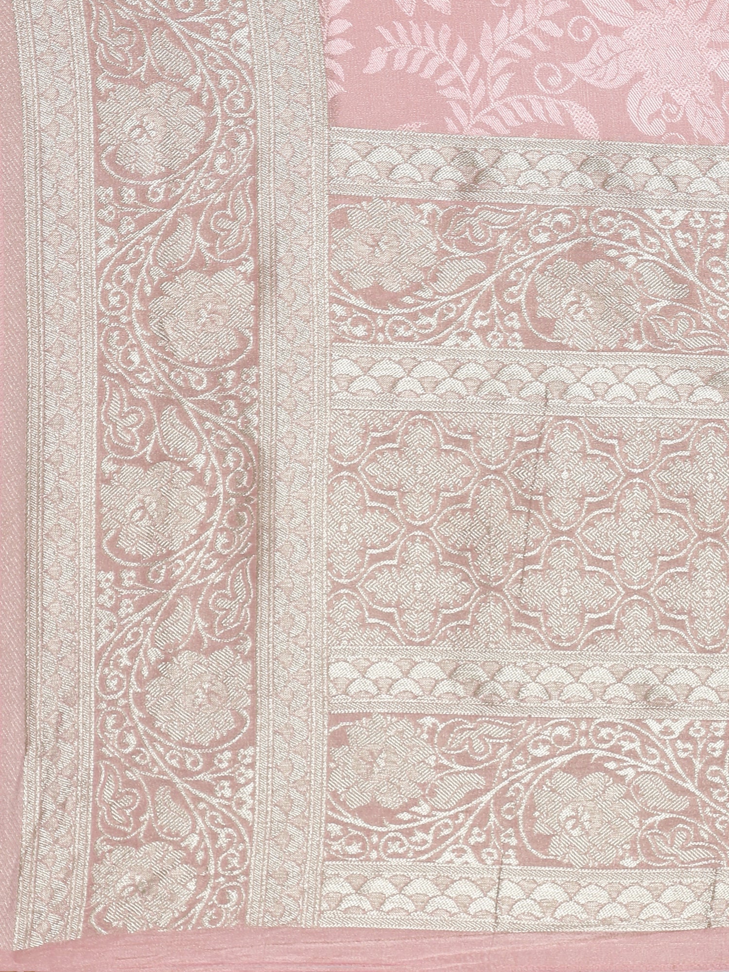 Elevate your elegance with this Baby Pink Banaras Weaved Saree, showcasing exquisite craftsmanship and timeless charm. The delicate weaving highlights intricate patterns that blend tradition with subtle sophistication, perfect for special occasions. Its soft pink hue adds a graceful touch, making it an ideal choice for those who appreciate refined style and cultural heritage.