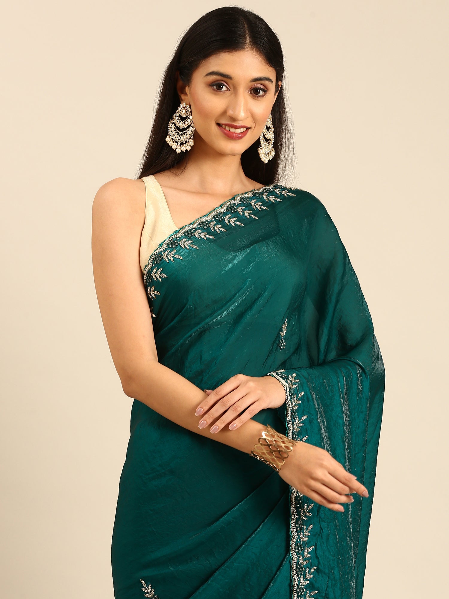 Green shimmer tissue saree with cut Dana & Swarovski embroidery