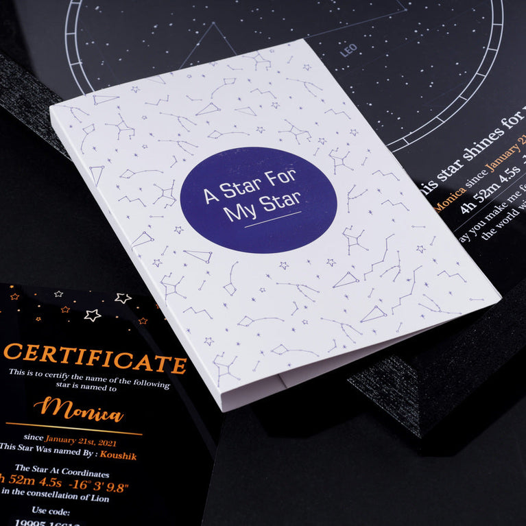 Specifications:Size of the frame: A4Please note that Oye Happy is a facilitator for the naming service, GiftYourStar, which is an Accredited Registrar of the Star Dedication Archives.The star can only be booked for the current year, not for previous years. If you input the date of the occasion as 17/03/1987, the star will automatically be booked for the current year, regardless of the entered date.