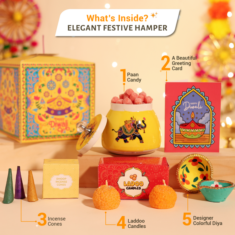 Introducing India’s First Patakha Box — a one-of-a-kind festive surprise that looks like a cracker but opens up as a magical hamper. It’s designed to give you the joy of lighting something special without any noise, or pollution.Celebrate Diwali with a thoughtfully curated hamper that includes:Paan candyLaddoo CandlesIncense ConesA beautiful Greeting CardDesigner Colorful DiyaHow It Works :The Patakha Box is simple and safe to use:Light the wick or pull it gently.Watch the box unfold in a magical way.Experience the joy of festive unboxing with none of the mess or worry.Specifications -Size of the box: 14 cm X 14 cm X 14 cm