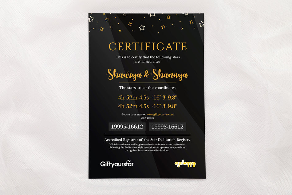 The stars are customized with the name of the special person and a constellation chart with the location of the stars. You can also add a personalized message to it.