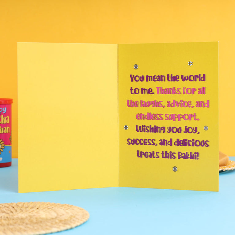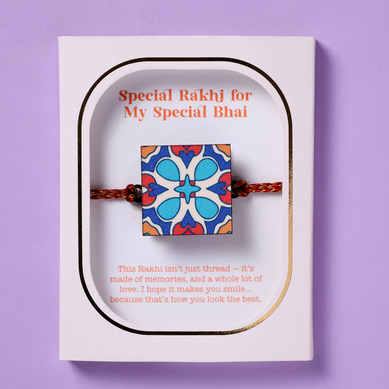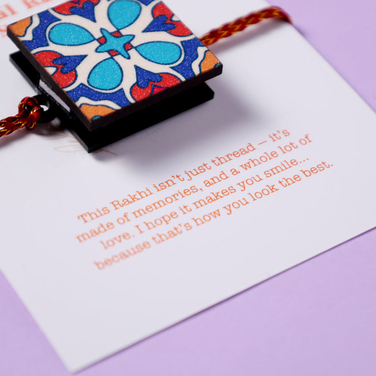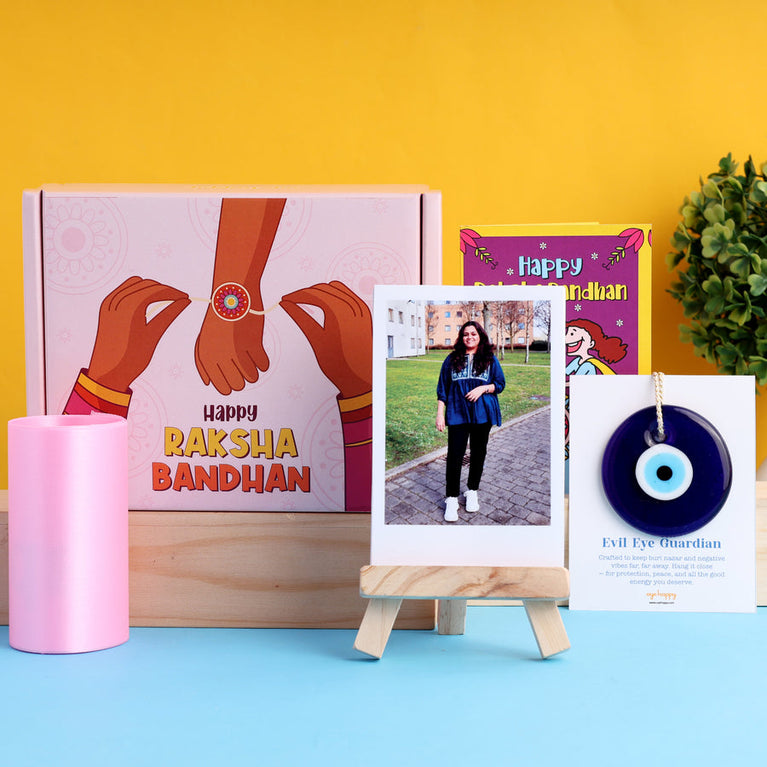 Celebrate Raksha Bandhan with this special hamper, designed to protect, pamper, and remind your sister just how amazing she is.Evil Eye Charm - A beautiful charm designed to ward off negative energy and protect your sister. Hang it in the room for constant protection and positivity.Wooden Easel – Customized with 5 Photos – A cute and personalized easel showcasing 5 of her best photos.Rakhi Card – A heartfelt card to send your love and blessings along with the rakhi, making the celebration extra special.Best Sis Sash – Because your sister is truly the best! Celebrate her with a fun and thoughtful sash that she’ll wear with pride.
