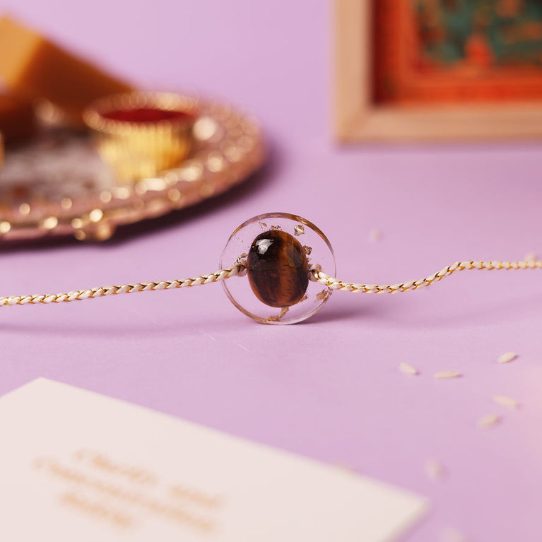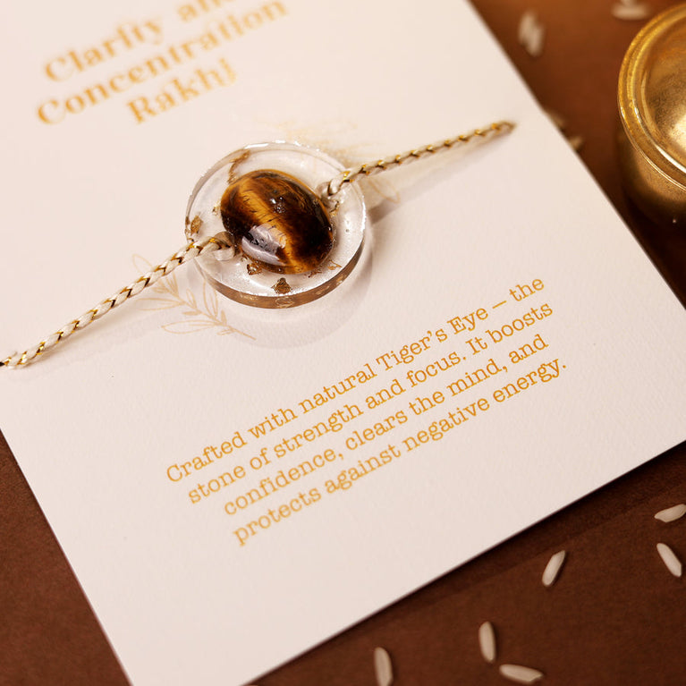 This Clarity and Concentration Rakhi is crafted with natural Tiger’s Eye, the stone of strength and focus. Known for boosting confidence, clearing the mind, and protecting against negative energy, this rakhi helps sharpen your brother's clarity and concentration.The Tiger’s Eye stone is authentic and certified by the Gemological Institute (certificate not included with the Rakhi).Tie this rakhi to your brother and empower him with focus, strength, and positive energy this Raksha Bandhan.Size: 3 x 3 cm