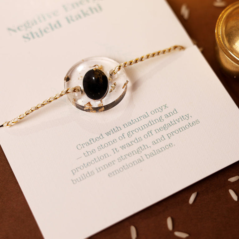 This Nazar Kawach Rakhi is crafted with natural onyx—the stone of grounding and protection. Known for warding off negativity, building inner strength, and promoting emotional balance, this rakhi carries powerful protective energy.The onyx stone is authentic and certified by the Gemological Institute (certificate not included with the Rakhi).Tie this rakhi to your brother and shield him with the strength and protection of onyx this Raksha Bandhan.Size: 2.5 x 2.5 cm