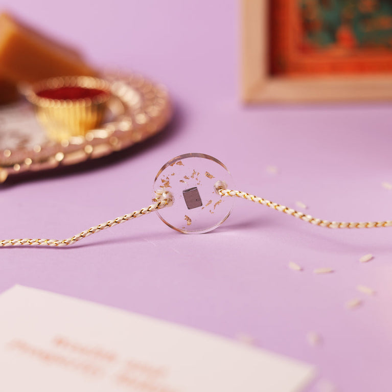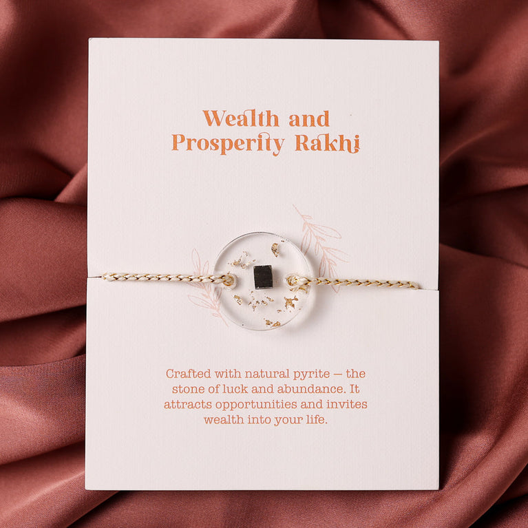 This Wealth and Prosperity Rakhi is crafted with natural pyrite, the stone of luck and abundance. Known for attracting opportunities and inviting wealth into your life, this rakhi brings prosperity to those who wear it.The pyrite stone is authentic and certified by the Gemological Institute (certificate not included with the Rakhi).Tie this rakhi to your brother and bless him with the energy of wealth, success, and endless possibilities this Raksha Bandhan.Size: 3 x 3 cm