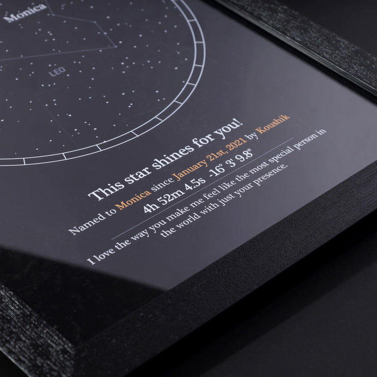 Specifications:Size of the frame: 29.74 cm x 41.91 cm.Please note that Oye Happy is a facilitator for the naming service, GiftYourStar, which is an Accredited Registrar of the Star Dedication Archives.The star can only be booked for the current year, not for previous years. If you input the date of the occasion as 17/03/1987, the star will automatically be booked for the current year, regardless of the entered date.If the sender's name is not provided, we will list it as "Star is named by Special Person" on the certificates.