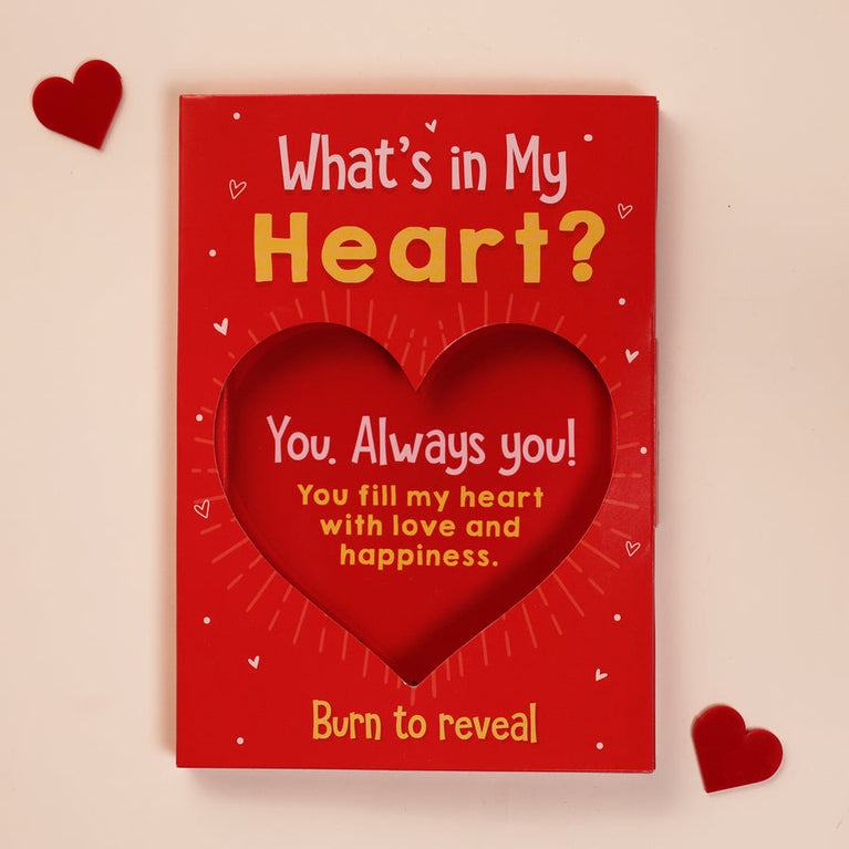 Does your love burn hotter than fire? Well, this romantic burning card definitely does. Just add a little flame to the heart and watch it burn to reveal a hidden message.Content on the card: What's in my heart? Burn to reveal.Inside content: You. Always You! You fill my heart with love and happiness.Card size: 13 cm x 18 cm