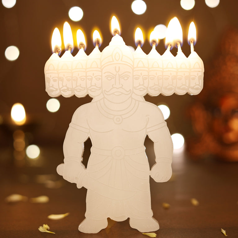 Celebrate the spirit of Dussehra and Diwali with this unique Ravan Candle. Crafted in the form of the ten-headed Ravan, it beautifully represents the age-old tale of good triumphing over evil. When lit, the candle creates a warm and festive glow, making it a striking addition to your décor.