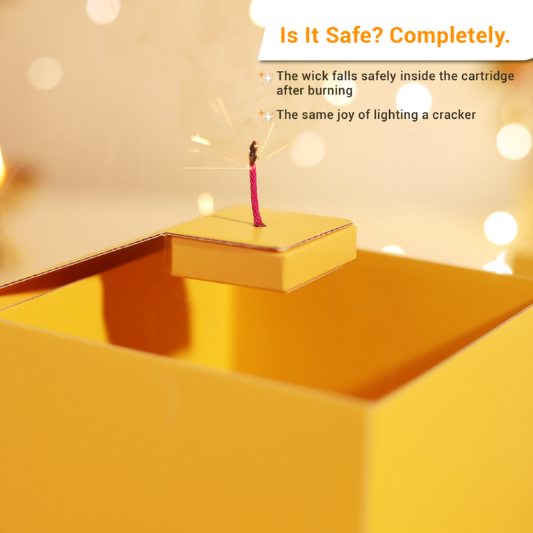 Introducing India’s First Patakha Box — a one-of-a-kind festive surprise that looks like a cracker but opens up as a magical hamper. It’s designed to give you the joy of lighting something special without any noise, or pollution.Celebrate Diwali with a thoughtfully curated hamper that includes:Gem Stone Tree Money stone Easel Spiritual Candle/leaf candle Diwali Greeting cardHow It Works :The Patakha Box is simple and safe to use:Light the wick or pull it gently.Watch the box unfold in a magical way.Experience the joy of festive unboxing with none of the mess or worry.Specifications-Size of the box: 14 cm X 14 cm X 14 cm