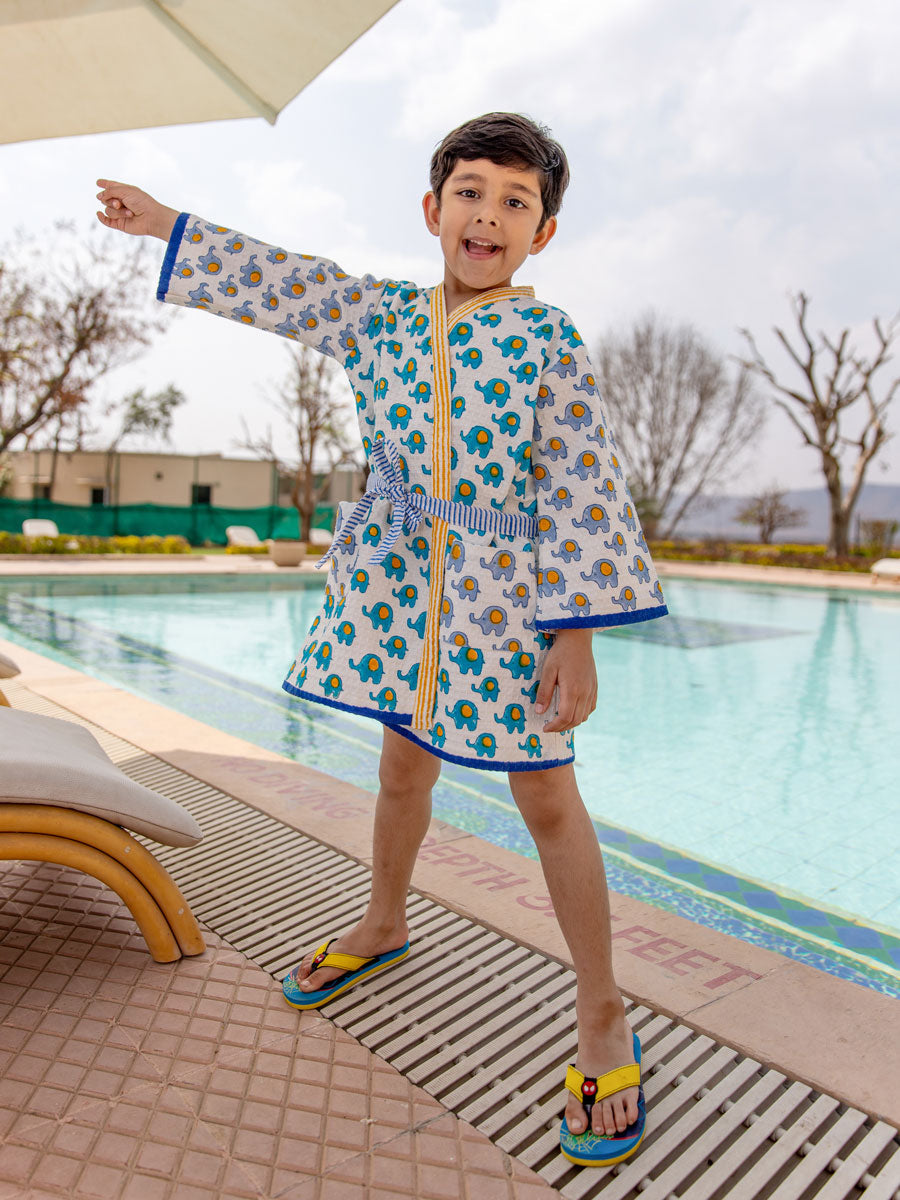 Bathing has never been more fun! Crafted in premium waffle cotton, these hand block print bath robes make for a cute addition in your child's wardrobe. The bath robe comes with an adjustable belt inside for easy fastening.