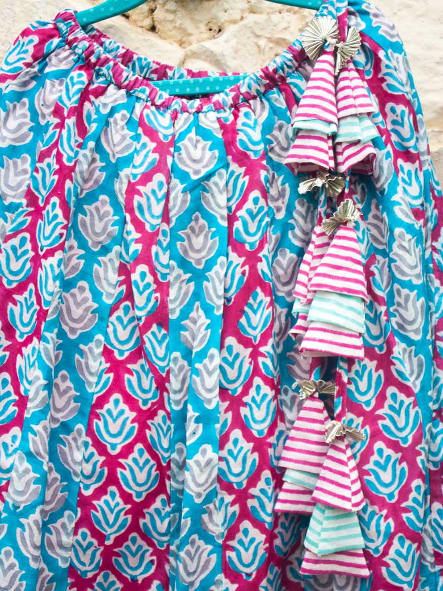 Skirt, top and dupatta in fine cotton silk; cotton lining, hand block printed; set contains one lehanga skirt, top with short sleeves, dupatta, and potli.