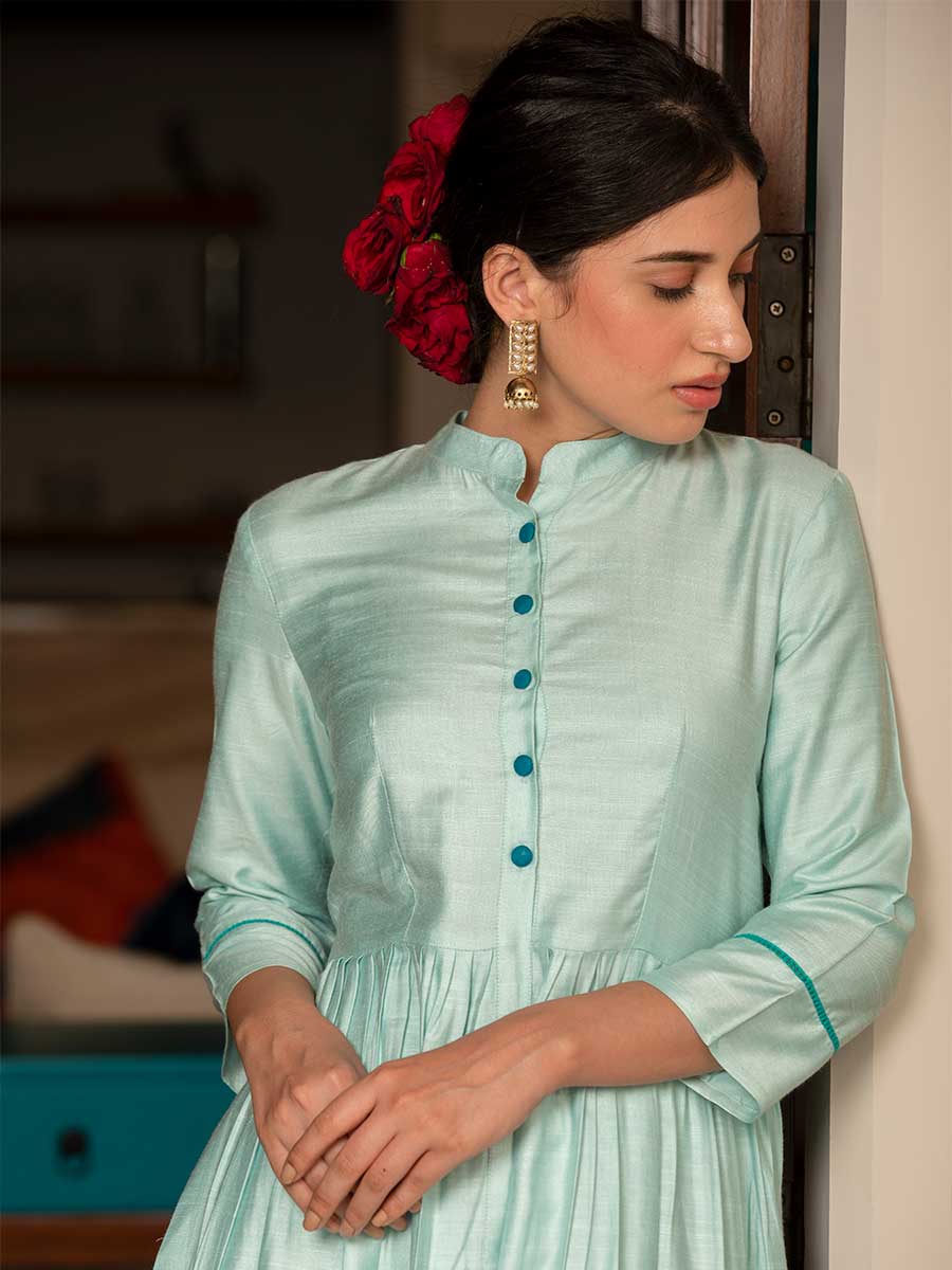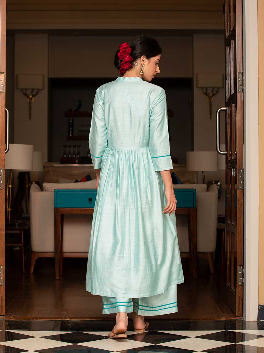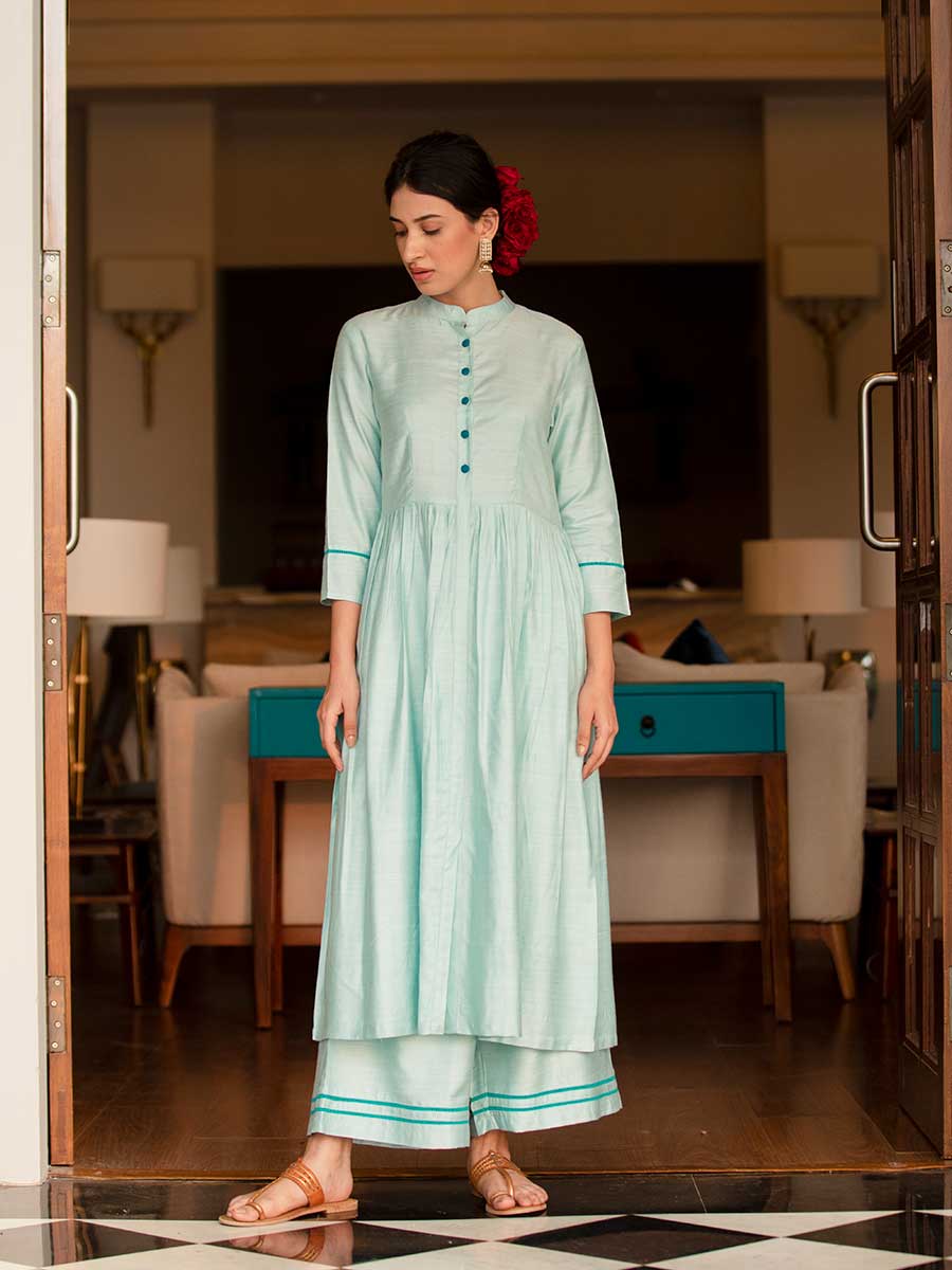 An elegant A-line long kurta made in silk blend with lace detailing to accentuate the design. Combine this with our complementing palazzo pants to make a set. Keep it simple and light on accessories. We recommend kolhapuris to complete the look. Our model is 5'6" and is wearing S. Note: Ships in 2-4 days.